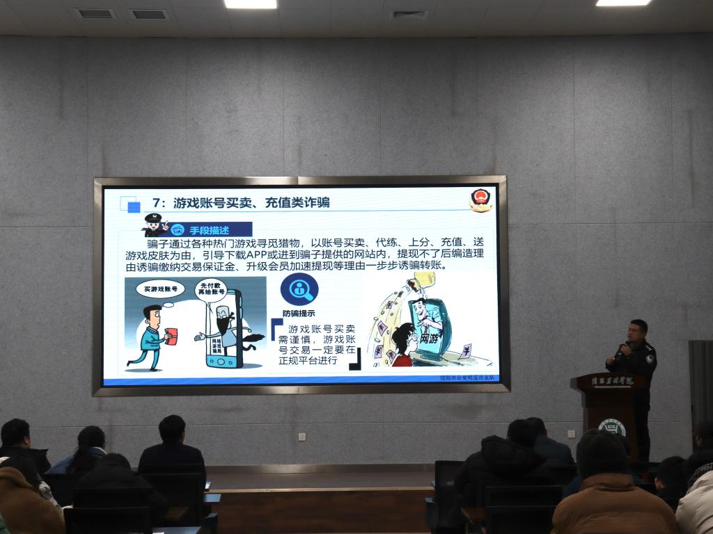 随后,在学术交流中心一楼报告厅,钱如意警官以“电信网络诈骗宣传防范”为题,结合beat365在线平台官网涉电诈典型案例,从电信网络诈骗的特点与趋势、电信网络诈骗的犯罪的常见手段、加强自身管理警惕涉电诈犯罪三个方面进行了具体详细的讲解。
