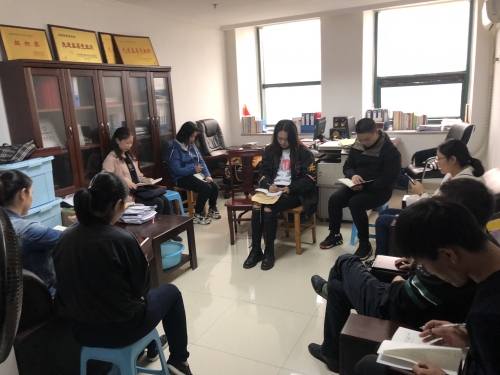 张老师带领大家学习文件《“不忘初心、牢记使命”主题教育总要求的四个维度》,文件提出党员干部落实“守初心、担使命、找差距、抓落实”总要求,要在“诚”、“勇”、“准”、“狠”这四个维度上深入理解、认真落实。张老师表示,党员教师要认真学习领会习近平新时代中国特色社会主义思想,学深悟透,对照四个维度不断改进日常教学工作,结合自身专业将思想政治理论教育带进课堂,充分发挥教工党员“双带头人”作用。