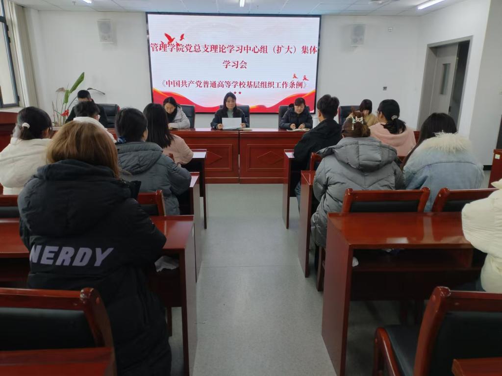 近日,管理学院党总支在双创408会议室召开理论学习中心组(扩大)集体学习会,集中学习《中国共产党普通高等学校基层组织工作条例》(以下简称《条例》)。此次学习会旨在进一步加强和改进高校基层组织建设,确保高校始终成为培养社会主义事业建设者和接班人的坚强阵地。院党总支书记王艳平主持会议。