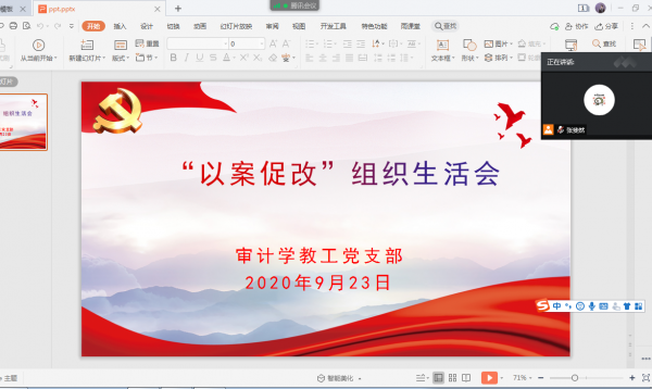 为深入贯彻落实学校与学院集中以案促改工作部署,营造风清气正的良好教学与工作氛围,9月23日,审计学教工党支部结合自身实际情况,借助腾讯会议平台开展线上以案促改专题组织生活会。会议由党支部书记荣国萱同志主持,全体党员教师参会。