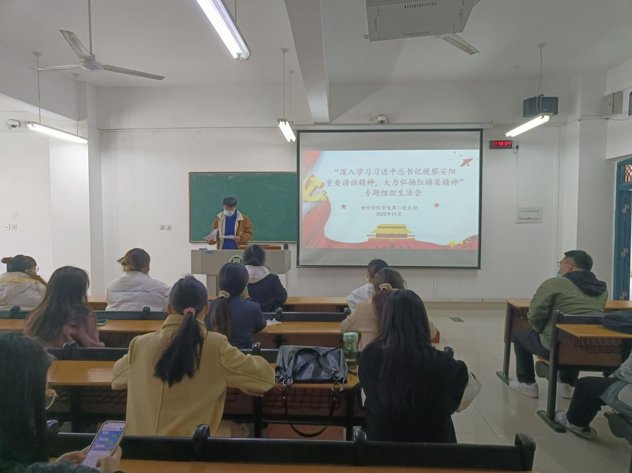 为深入学习贯彻党的二十大精神和习近平总书记视察河南安阳重要讲话精神,大力弘扬红旗渠精神,财经学院学生第二党支部于11月24日在二教101室召开“深入学习习近平总书记视察安阳重要讲话精神,大力弘扬红旗渠精神”专题组织生活会。支部全体党员参会,会议由支部书记吴昊主持。