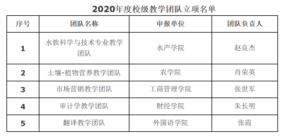 申报2020年度的本科专业教学团队,在各院(部)积极推荐,教务处资格初审,经会议评审推荐、再投票,同意以下5个教学团队立项,现予以公示。公示期3天(2020年4月9-2020年4月11日)。