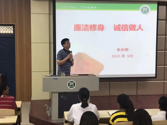 9月24日,在二号教学楼204教室,财经学院党总支书记朱长明为2019级新生做了关于“廉洁修身 诚信做人”的入学教育报告会。