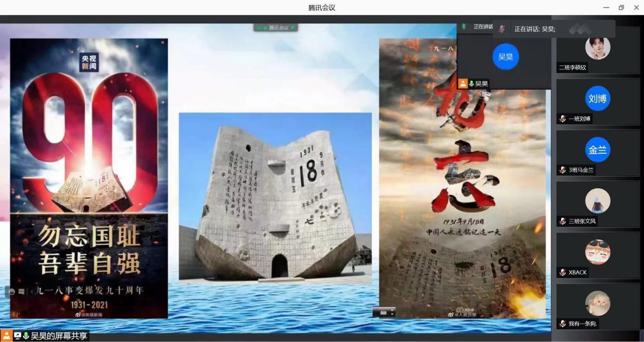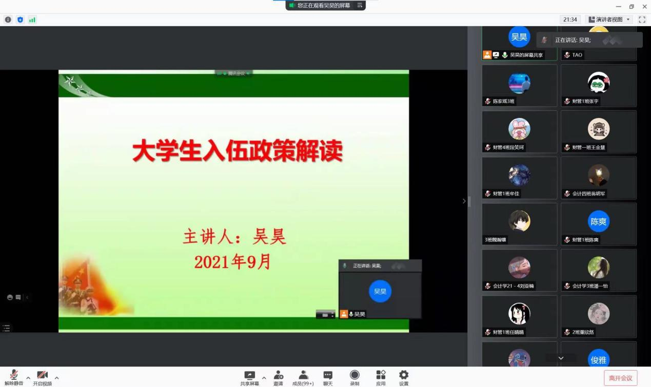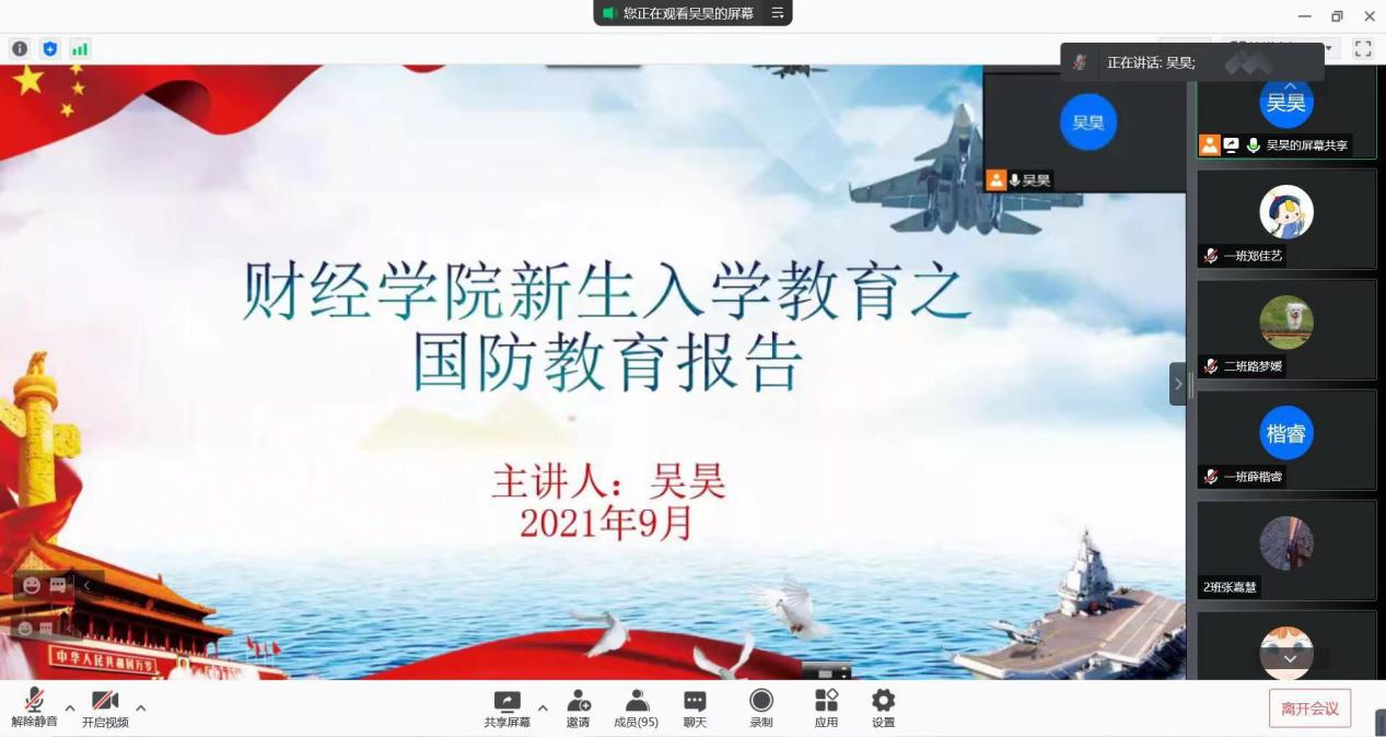 为增强新生的国防意识,激发广大新生参军报国的热情。财经学院于2021年9月18日通过线上腾讯会议举办以“天下兴亡、匹夫有责”为主题的国防教育报告暨征兵入伍宣讲会,由武装专干吴昊老师主讲,全体2021级新生积极参与。
