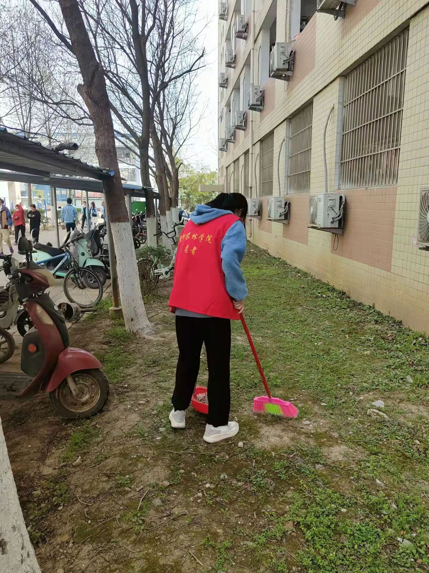 为使广大青年学习自觉养成热爱劳动、热爱生活,维护校园环境的良好习惯,三月,财经学院团总支多次组织我院青年团员进行校园清扫志愿活动,活动中,同学们手拿扫帚、垃圾斗等工具纷纷行动起来,他们发扬不怕苦、不怕脏的精神,不放过任何细节,在校园道路、宿舍楼空地,乒乓球场地等区域,对大树的落叶,角落的垃圾等认真清理打扫。学校内“红马甲”的身影随处可见,这抹志愿红,成了春日里最温暖的颜色。
