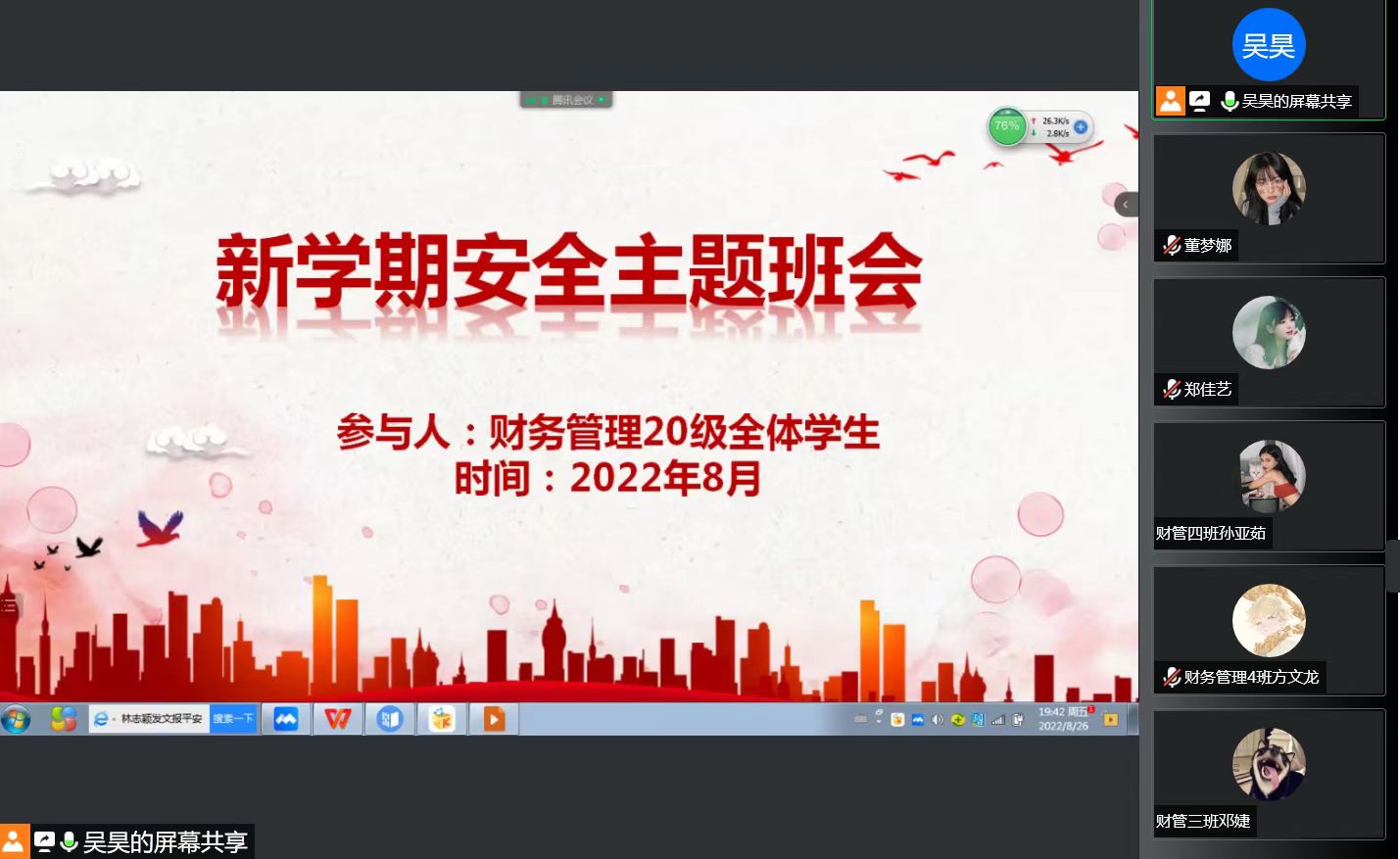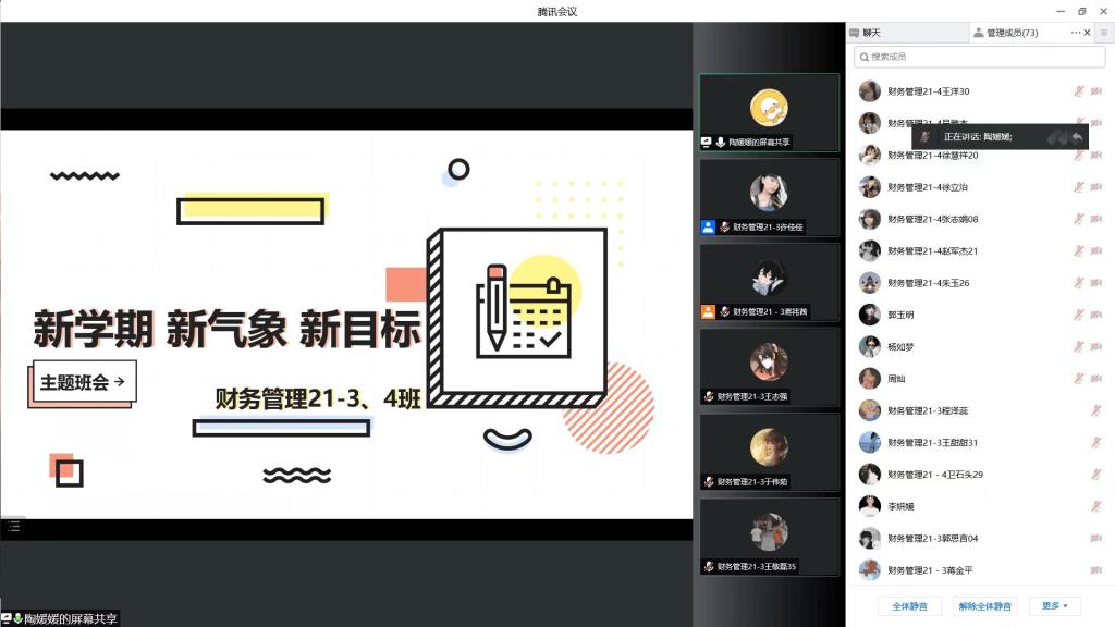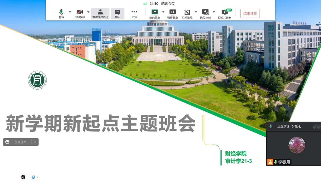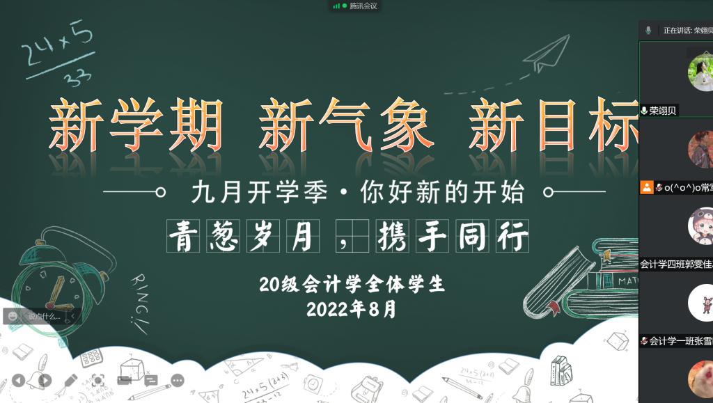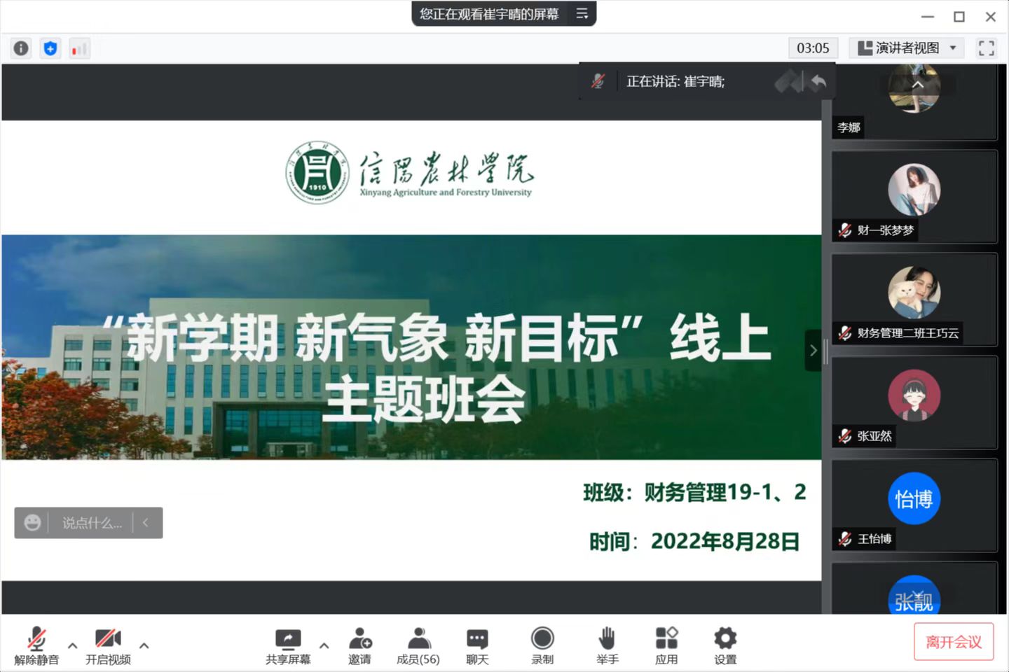 为做好疫情防控工作,增强同学们的安全防范意识,确保新学期各项工作地有序开展,财经学院于8月27-28日,各班分别召开“新学期 新气象 新目标”线上主题班会,会议由各班辅导员主持,全体学生参加。