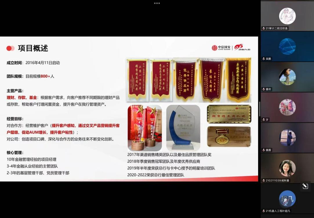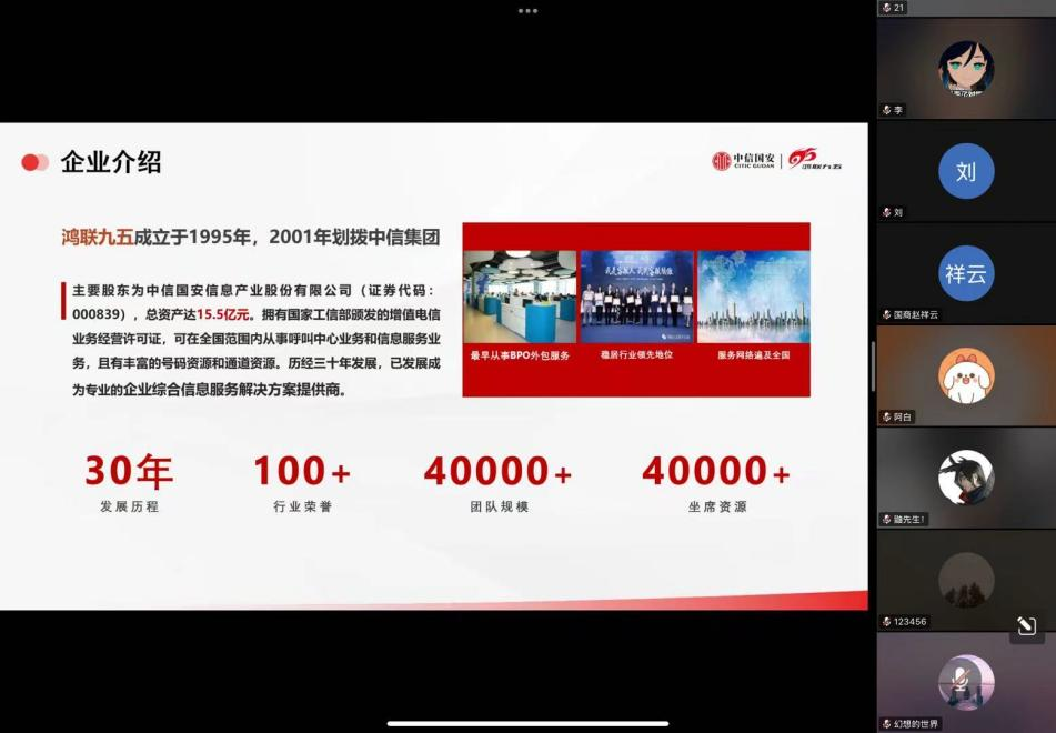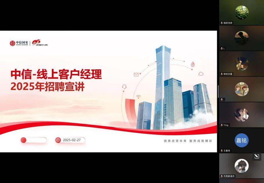 为进一步拓宽毕业生就业渠道,搭建校企对接平台,助力学生高质量就业,管理学院于3月26日在线上举办“中信银行储蓄卡新岗位校园招聘会”,活动由广东鸿联九五信息产业有限公司招聘经理韩佳峻主讲,学院有就业意向的2025届毕业生参加了活动。