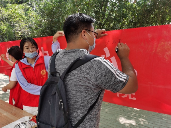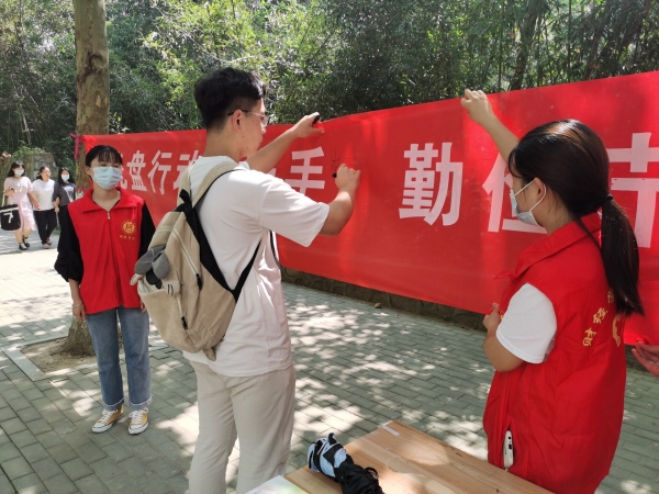 活动现场“光盘行动手牵手 勤俭节约心连心”的宣传横幅映入眼帘,财经学院青年志愿者引导经过的广大师生在横幅上签下自己的名字,承诺将自觉践行“光盘行动”,养成珍惜粮食、厉行节约的好习惯,向“舌尖上的浪费”说“不”。