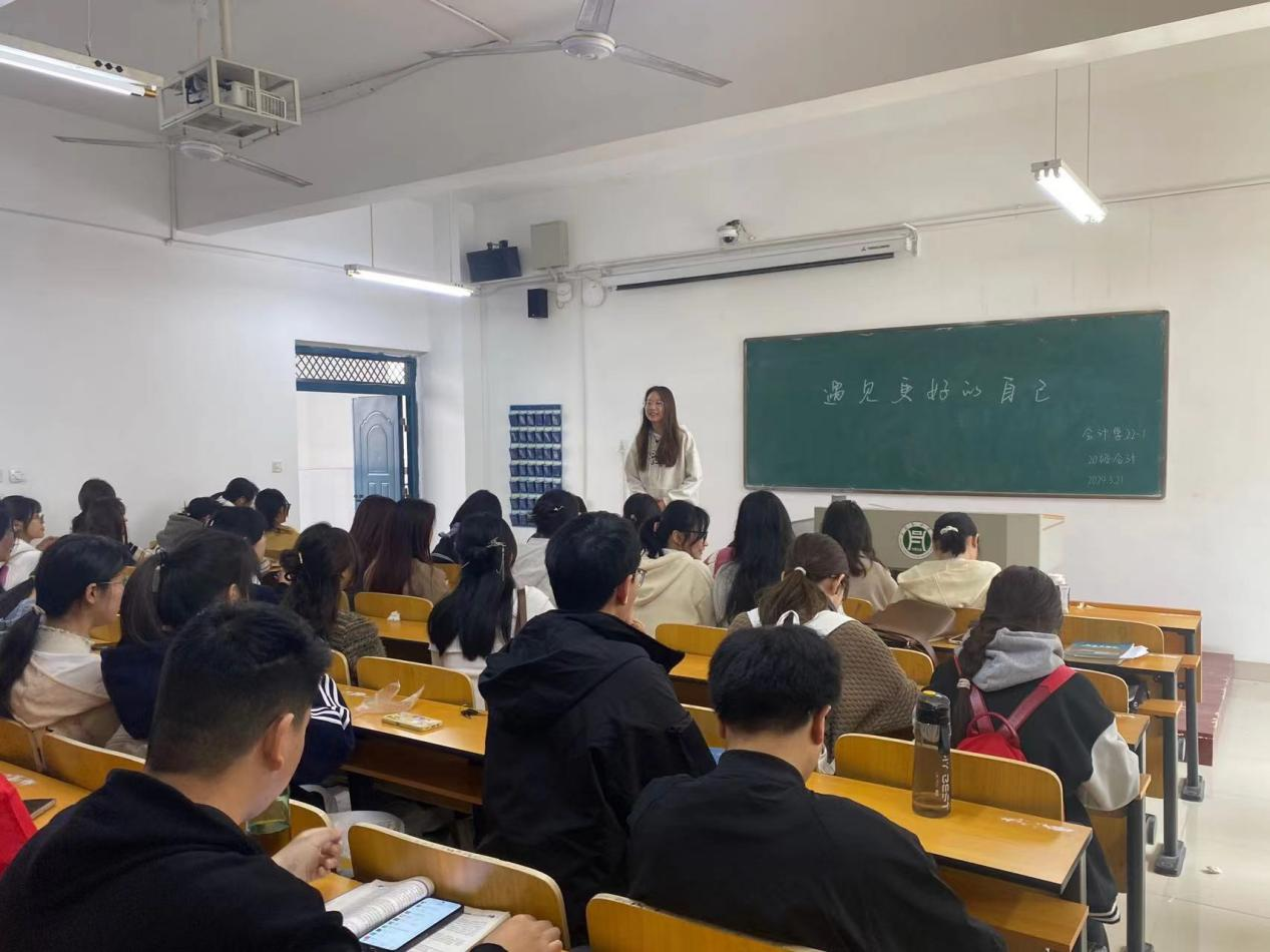 为进一步普及心理健康知识,全面提升大学生心理健康教育,帮助我院学生更好地认识自己,关注自身心理成长,掌握自我探索与自我提升的知识,管理学院积极响应学校的号召,于3月16日晚七点组织学生代表、学院学工队伍及教师代表在二教206集中观看“遇见更好的自己”主题心理健康公开课,其余学生,老师及家长采用分散观看的方式,学生代表纷纷分享自己在此次公开课中的心得体会,随后,各班召开“遇见更好的自己”的主题班会,进一步巩固学习效果。