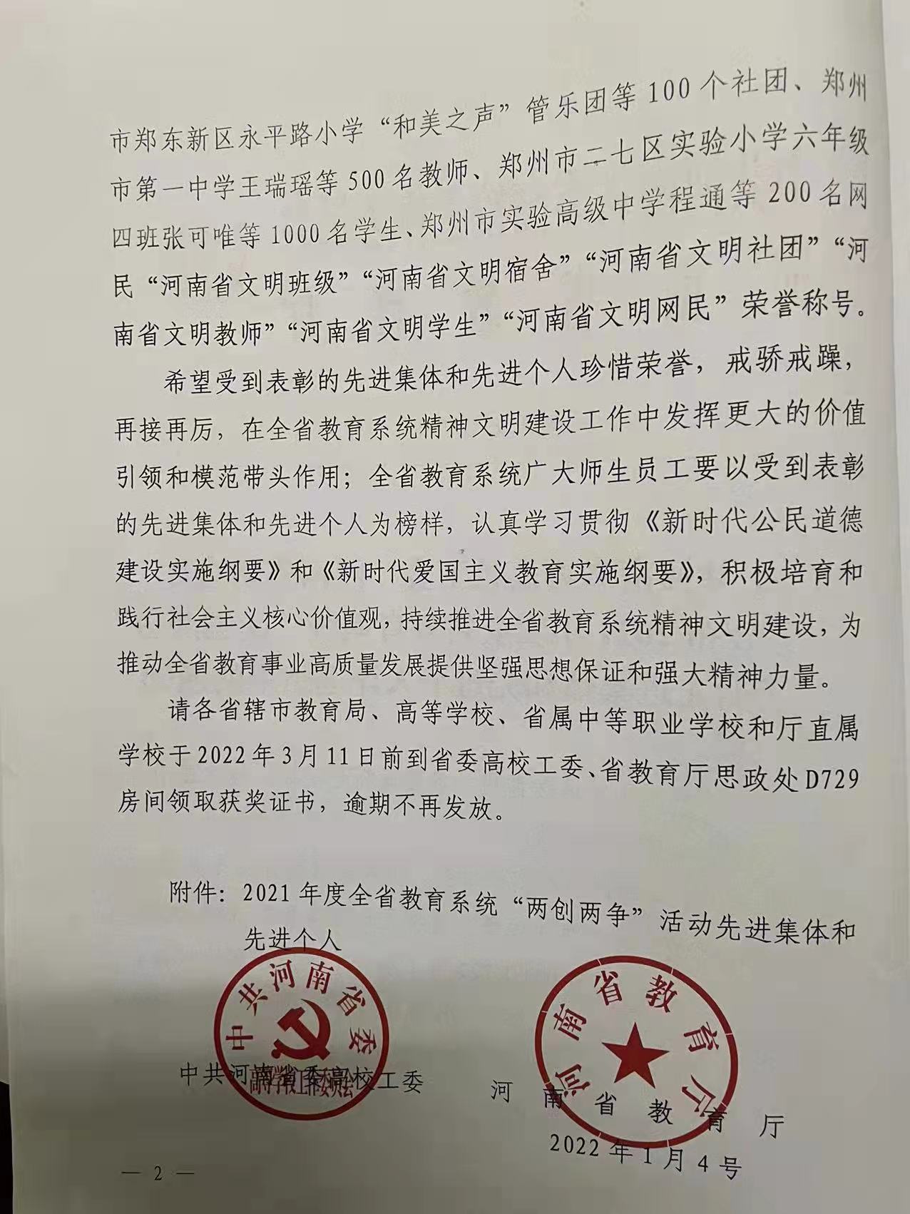 日前,中共河南省委高校工委、河南省教育厅印发了《中共河南省委高校工委 河南省教育厅关于公布 2021 年度全省教育系统“两创两争”活动先进集体和先进个人评选结果的通知》(豫高发〔2022〕3 号),公布了2021年度全省教育系统“两创两争”活动先进集体和先进个人评选结果。茶学院党总支副书记、茶文化与营销教研室教师朱建梅被授予“河南省文明教师”,茶学(茶文化与营销方向)2019级的蒋艳群同学被授予“河南省文明学生”荣誉称号。
