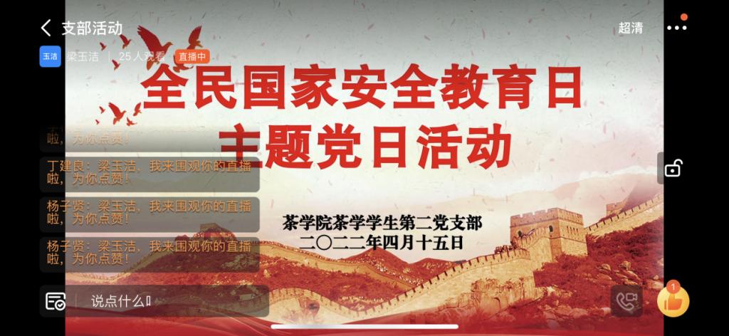 4月15日是国家安全教育日。为引导大学生党员牢固树立国家安全无小事、维护国家安全必须从自身做起的观念,进一步提高学生党员国家安全意识、风险意识、反间谍意识、保密意识,增强国家安全责任,4月15日,茶学学生第二党支部在网络平台开展了“全民国家安全教育日”主题党日活动,支部书记梁玉洁主持,支部党员参加了活动。