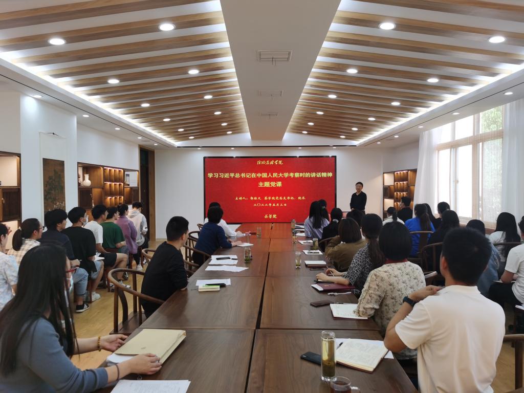 郭桂义指出,要把学习宣传贯彻落实习近平总书记重要讲话精神作为当前和今后一个时期的首要政治任务,学院还将继续组织全体师生持续深入学习习近平总书记在中国人民大学考察时的重要讲话精神,与党的十八大以来习近平总书记对高校师生一系列重要指示精神紧密结合起来,更加深刻领会“两个确立”的决定性意义,更加有力增强“四个意识”、坚定“四个自信”、做到“两个维护”,响应习近平总书记的号召:新时代中国青年要树立远大理想、热爱伟大祖国、担当时代责任、勇于砥砺奋斗、练就过硬本领、锤炼品德修为,以实际行动迎接党的二十大胜利召开。(撰稿人:丁岚 审核人:朱建梅)