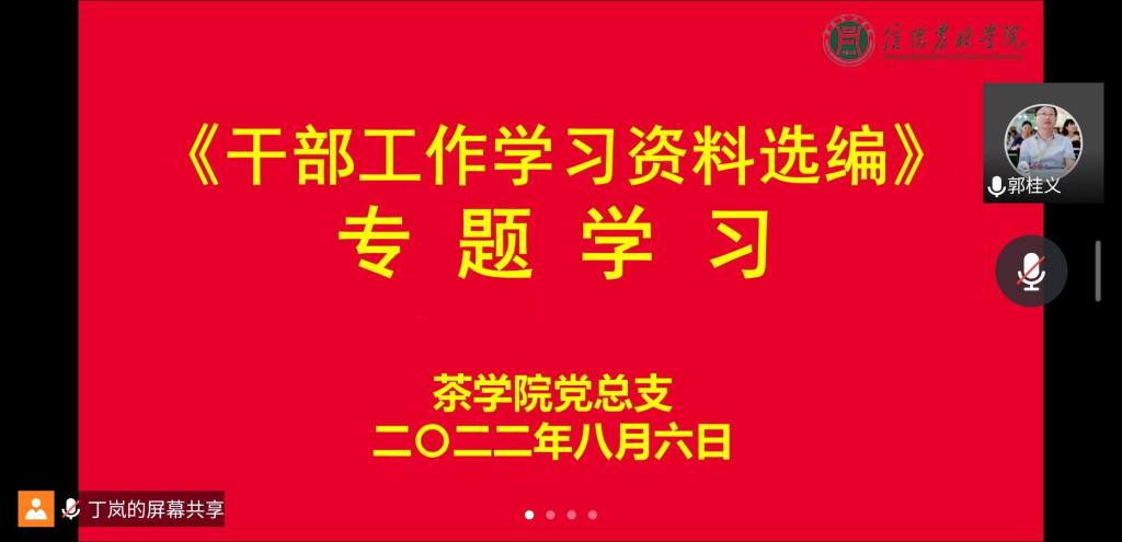 8月6日下午,茶学院党总支通过腾讯会议召开理论学习中心组(扩大)专题学习会,学习《干部工作学习资料选编》。茶学院党总支书记、院长郭桂义,副院长孙慕芳、陈义及全体科级干部参加会议,会议由党总支副书记朱建梅主持。