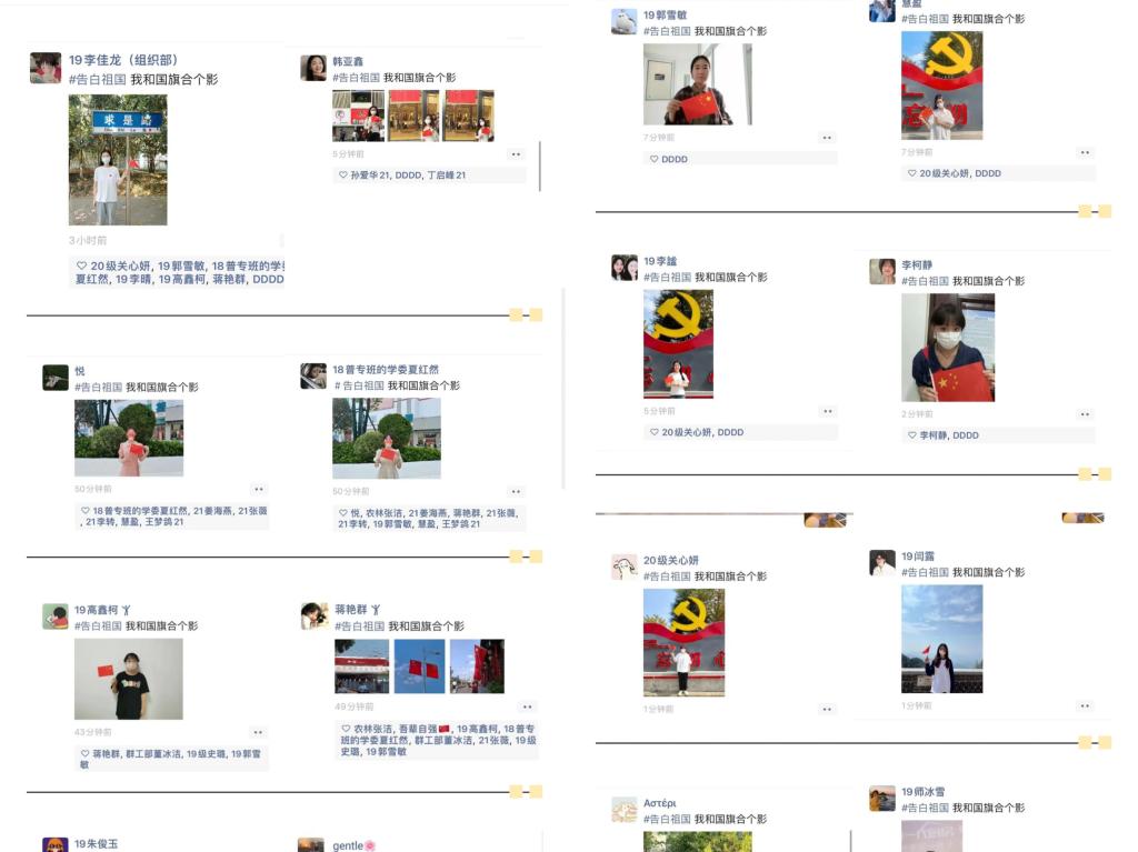 为庆祝祖国73周年华诞,迎接党的二十大胜利召开,进一步激发支部党员的爱国热情,茶学院茶学学生第一党支部通过朋友圈打卡“#告白祖国.我和国旗合个影”和歌曲演唱歌颂祖国的形式,开展“献礼国庆节,喜迎二十大”主题党日活动,为祖国庆生,充分表达了对祖国的热爱和赞美。