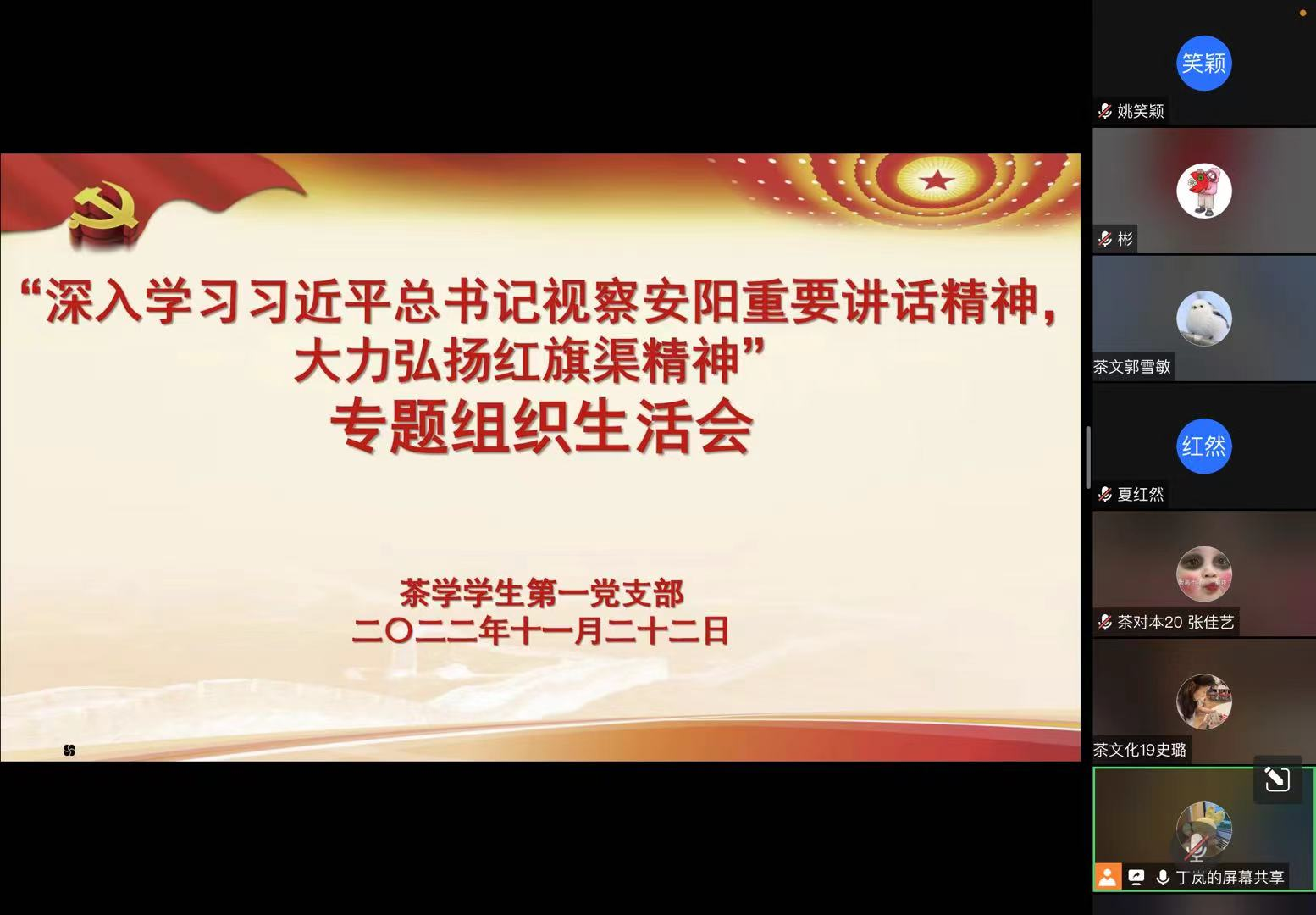 为深入学习贯彻党的二十大精神和习近平总书记视察安阳的重要讲话精神,领会红旗渠精神的丰富内涵和时代价值,11月22日晚上,茶学院茶学学生第一党支部于腾讯会议线上顺利召开“深入学习习近平总书记视察安阳重要讲话精神,大力弘扬红旗渠精神”专题组织生活会。本次会议由茶学学生第一党支部书记丁岚主持,支部全体党员、预备党员参加。