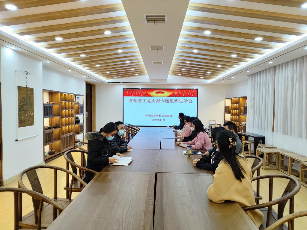2022年11月22日午,茶学院茶学教工党支部在茶学院1C202召开“学习红旗渠精神 庚续红色血脉”为主题的专题组织生活会。会议由支部书记黄双杰主持,支部全体党员到会,茶学院副院长孙慕芳和陈义同志以普通党员身份参加