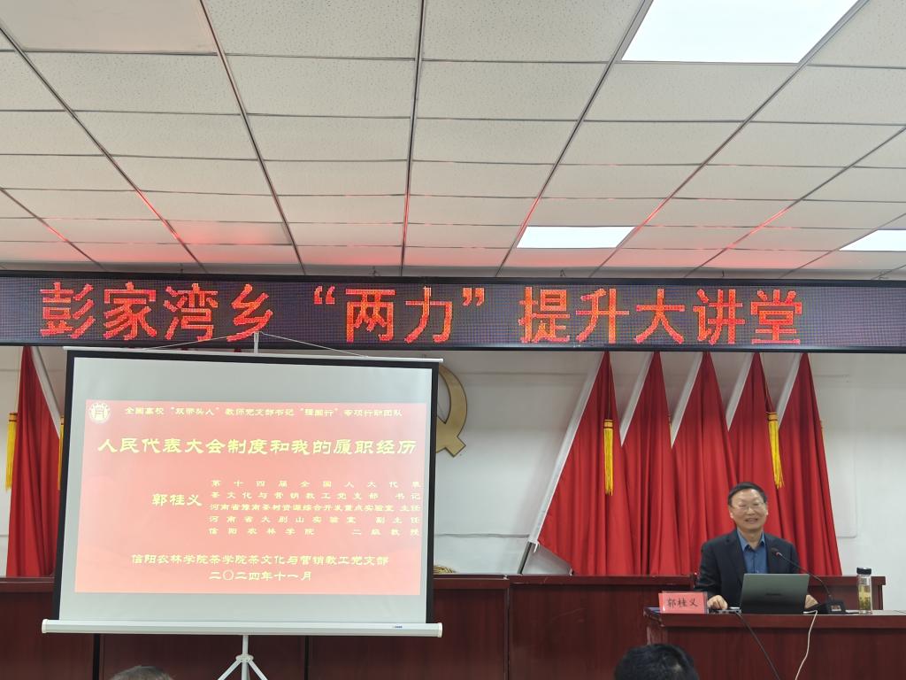 为扎实开展“提高执行力,增强落实力”作风建设专项行动,进一步提升乡机关干部政治理论水平和实践能力,11月7日,羊山新区彭家湾乡开展“两力”提升大讲堂活动,乡党政班子成员,全体机关干部共计70余人参加活动。全国高校“双带头人”教师党支部书记“强国行”专项行动团队beat365在线平台官网茶文化与营销教工党支部书记、第十四届全国人大代表、二级教授郭桂义应该乡党委邀请以《人民代表大会制度和我的履职经历》为题做专题讲座。
