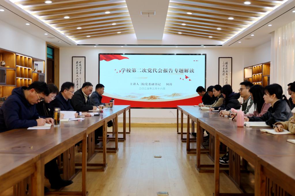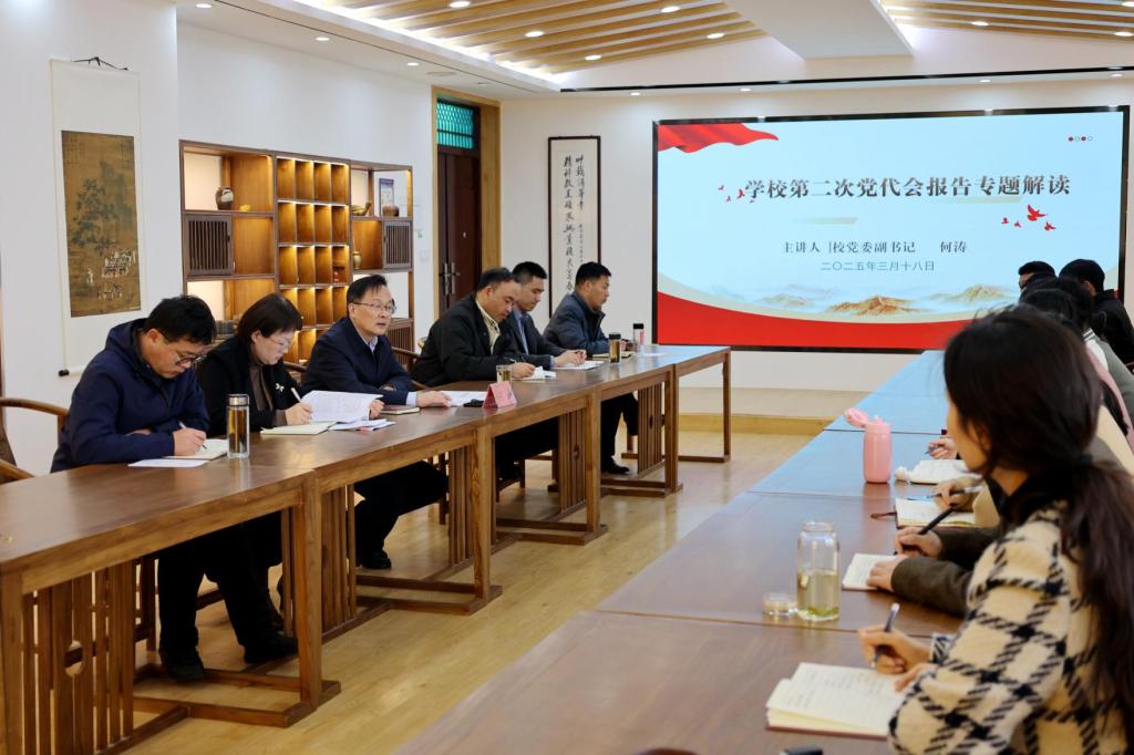 何涛从召开背景、重大意义、新时代新征程学校发展的新蓝图、未来五年学校事业发展的重要举措等方面全面深入地解读了学校第二次党代会精神。在解读学校党委工作报告时,何涛详细地介绍了报告起草的严谨过程,深入阐述了报告“两全面”“两突出”“四个相统一”的特点和报告六个部分的主要内容。着重强调了学校未来全面建成特色鲜明的高水平应用型农林大学的总体目标,以及围绕“12556”强基提质战略及“十大工程”发展规划。他指出,学校第二次党代会是在关键时期召开的重要会议,大会通过两项重要决议,选举产生了学校新一届党委、纪委委员,成果丰硕。此次大会承前启后、意义非凡,为学校发展规划了清晰路径,提供了坚实组织保障。
