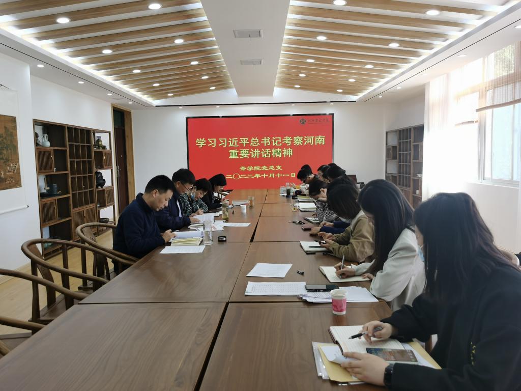 10月11日下午,茶学院党总支在1C201召开政治理论集中学习会,再次学习习近平总书记视察河南重要讲话精神,茶学院全体教师参加会议,会议由茶学院院长、党总支书记郭桂义主持。