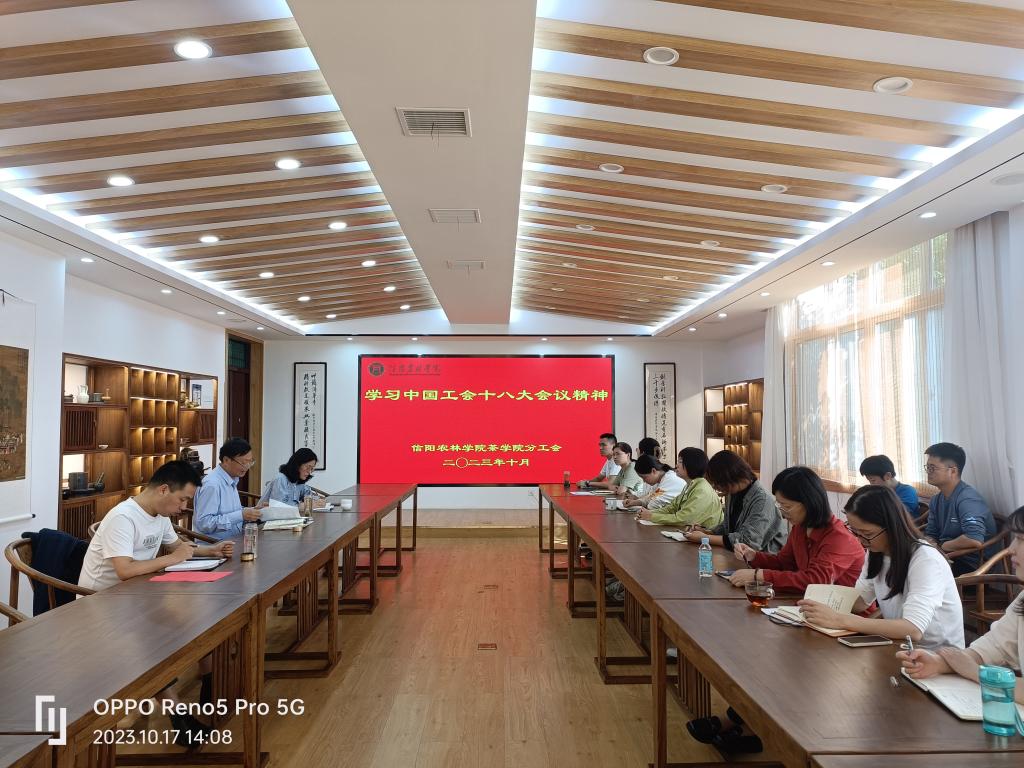 10月17日下午,茶学院分工会在1C201组织全体教师学习中国工会十八大精神。会上,茶学院分工会主席朱建梅领学了蔡奇同志《奋力书写我国工人阶级投身强国建设民族复兴的壮丽篇章》致词和王东明同志《以习近平新时代中国特色社会主义思想为指导组织动员亿万职工为强国建设民族复兴团结奋斗》主题报告。