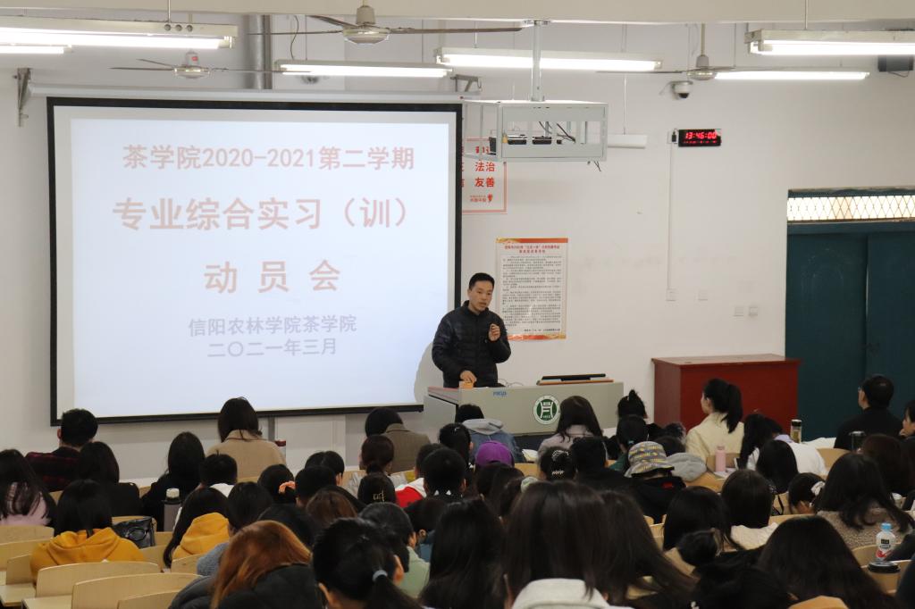 3月23日中午,茶学院在2教304召开2018级茶学(创新拓展)、2018级茶学(茶文化与营销)、2018级茶学(对口)、2020级茶学(专升本)及2019级茶艺与茶叶营销专业综合实习(训)动员会,动员会由茶学副院长孙慕芳主持。茶学院院长、党总支书记郭桂义教授、副院长陈义、党总支副书记朱建梅、茶学实验教学中心主任尹鹏、教学秘书张永瑞、辅导员池水靖、杨转、梁玉洁等教师参加了此次动员会。本次专业综合实习(训)涉及216名学生,67家茶企,其中包括了11处校外实习基地。