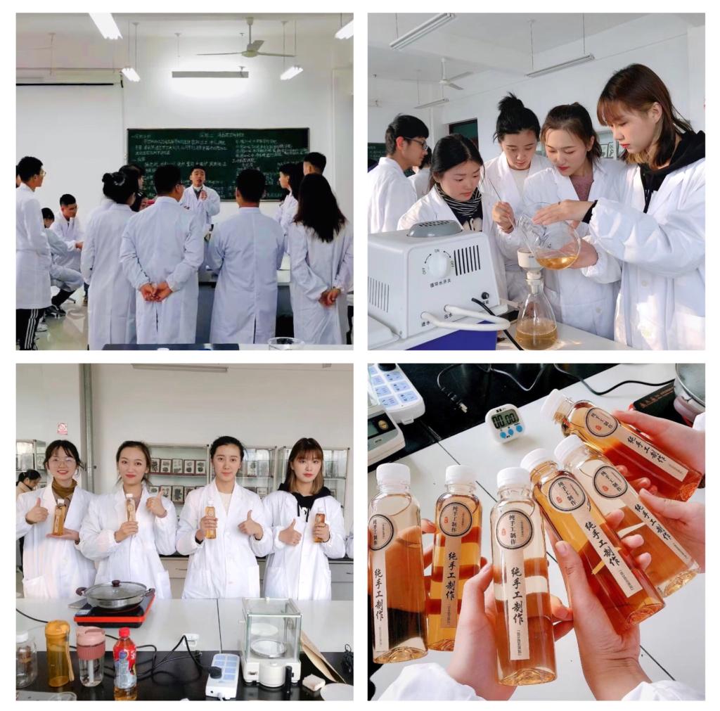 授课教师张永瑞、朱尧老师以市场上茶时尚快消品为产品目标,增设了“速溶茶感官评价”、“抹茶感官审评”、“冰红茶饮料制作”、 “风味调饮茶制作”、“抹茶雪花酥制作”、“抹茶牛轧糖制作”、“茶瓜子的加工”、“抹茶酱制作”等项目。其中“冰红茶饮料制作”、“风味调饮茶制作”为综合性实验,学生根据茶叶原料(速溶茶、超微茶粉、袋泡茶)的特性、茶饮料制作流程、茶色素与花青素的色彩运用等进行设计与分组实施。《茶叶综合利用》课程具有时代性、实践性特点,以学生为中心,注重提高学生学习兴趣和开发学生创造性,受到了学生的欢迎和好评。今后,课程在确保实践性的基础上,希望能在课程高阶性上有所突破。(茶学院 张永瑞 朱尧)
