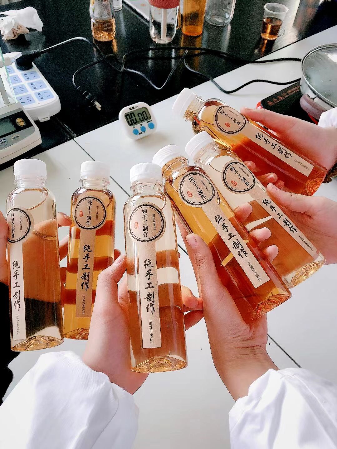 茶叶综合利用是茶学一门专业选修课,课程内容随茶产业链向第三产业延伸而不断充实更新。 茶学院为了加强课程组建设,2020年从安徽农业大学新进朱尧老师(茶综合利用方向)。 本次实验课由课程主讲教师张永瑞,朱尧老师授课,采用设计性实验方式,让学生根据个人口味来调节柠檬酸及白砂糖用量,以及不同茶类及不同香型来制作了“柠檬红茶”、“蜜桃乌龙”、“茉莉花茶”等风味茶饮料,并对自制茶饮料与市场上“统一”、“康师傅”等品牌茶饮料进行感官审评分析,讲述茶饮料的酸甜滋味的原料来源、香型与茶类的搭配原理。