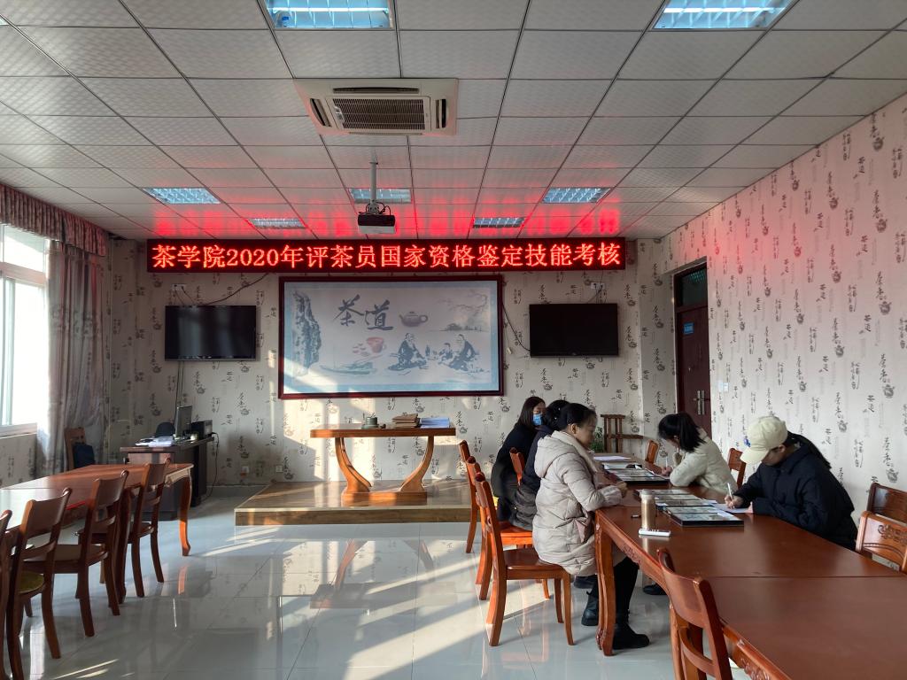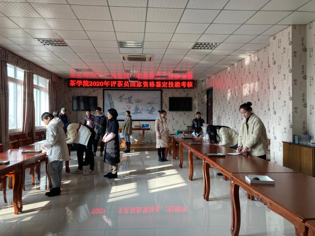 2020年12月4日,茶学院和郭桂义国家级技能大师(评茶员)工作室与信阳市人力资源与社会保障局就业训练中心联合组织开展了“中级评茶员”国家职业资格鉴定。茶学院2017级茶学(创新拓展)、2017级茶学(茶文化与营销)(创新拓展)、2017级茶学(对本)、2019级茶学(专升本)、2018级茶艺与茶叶营销(普专)、2018级茶艺与茶叶营销(对专)共158名本专科同学参加了鉴定。茶学院专业教师陈义、刘佳、张永瑞和市就业训练中心工作人员担任考评员,专业教师张洁、池水婧、尹鹏、杨转、王杉、黄双杰、梁玉洁、朱尧、杜之正、王晶晶、夏雨参与了鉴定考务工作。