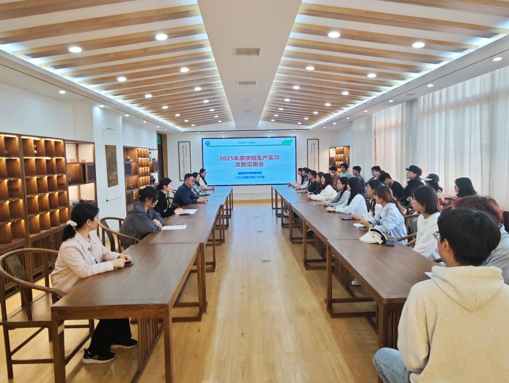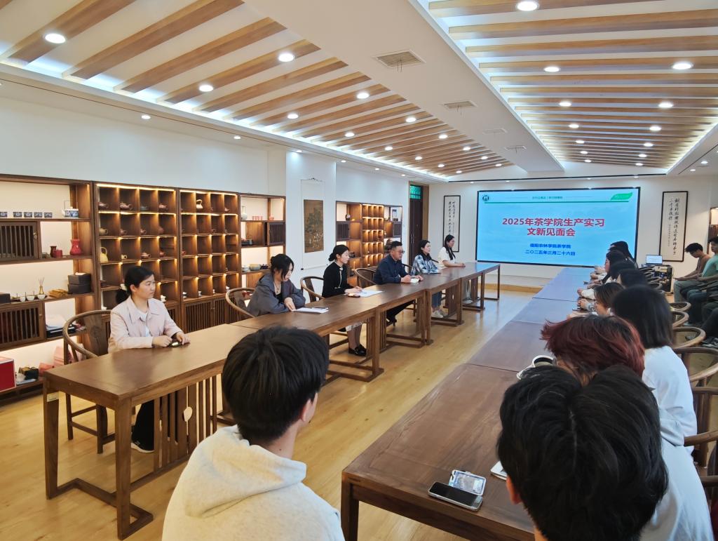 3月26日中午13:00,我院在科技楼1C201召开茶学专业生产实习文新见面会。茶学院副院长尹鹏、生产实习负责人苏丹、辅导员卫艺炜,文新茶叶公司代表向宁、刘厚红以及32位即将奔赴实习岗位的学生齐聚一堂,共同开启生产实习新征程。