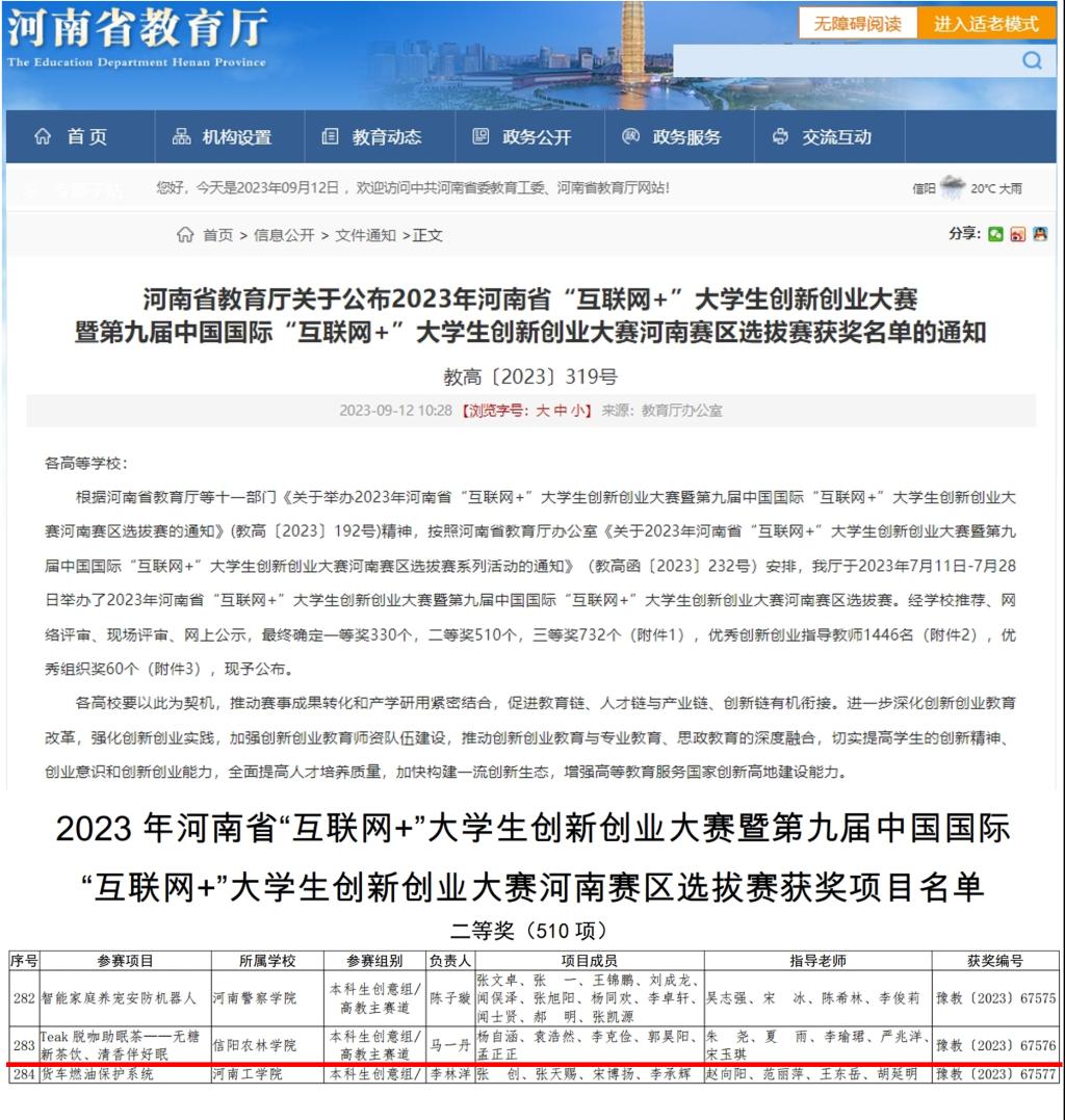 最终,在朱尧、夏雨等老师的指导下,我院《Teak 脱咖助眠茶—无糖新茶饮 清香伴好眠》项目获得2023年河南省“互联网+”大学生创新创业大赛二等奖。