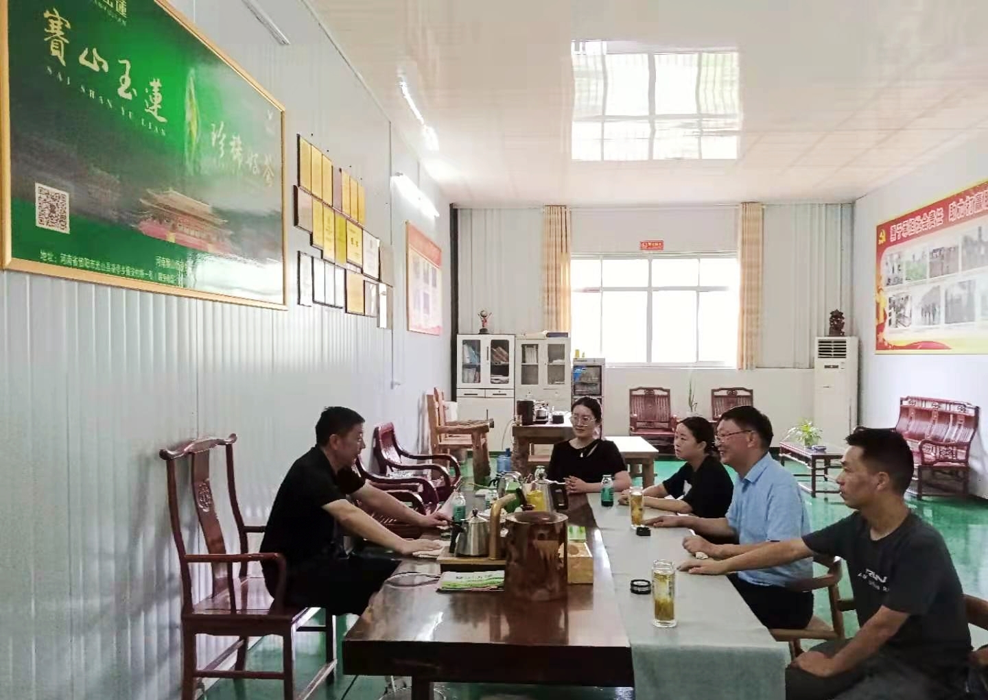 服务团成员听取了河南赛山悟道生态茶业科技有限公司董事长兼总经理匡祯超先生关于茶树品种栽培与管理现状的介绍,现场先后考察了中茶108、中茶111、浙农117、龙井43、槠叶齐、乌牛早、农抗早、金玫瑰、黄金叶、白毫早、信阳10号、中黄1号、中黄3号、中白1号、白叶1号、春雨1号、茂绿、劲峰等十八个茶树品种的生长现状与品种特征,探讨不同茶树品种的品质差异,为后续共同开展茶树品种的耐高温性和抗旱性研究奠定基础。