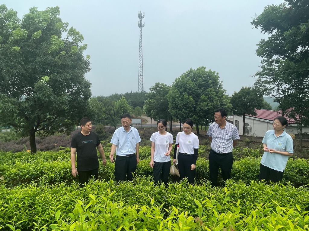 在光山县净居寺茶场,郭桂义教授与茶场负责人曹璐就近期连日阴雨导致茶园长势不佳、茶园病虫害、夏秋茶资源利用程度低、茶叶生产成本高等问题进行交流并强调夏季天气原茶树病虫害高发,应注意茶园绿色防控。