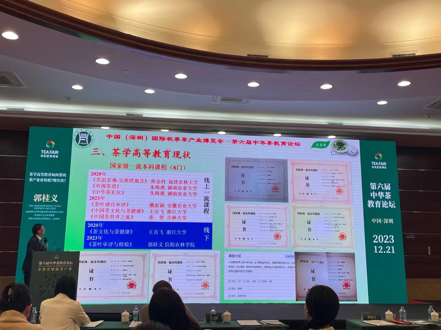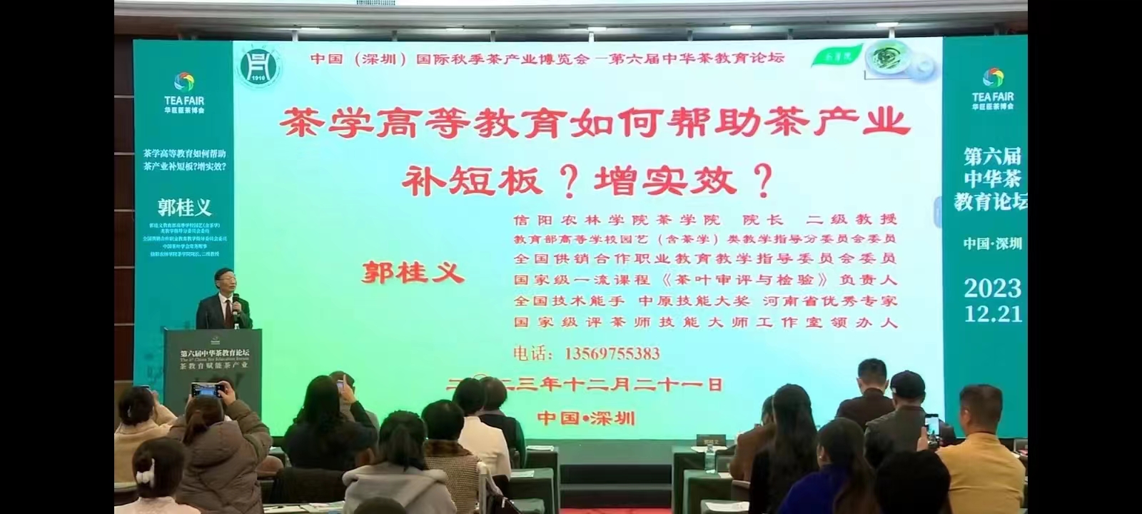 2023 中国(深圳)国际秋季茶产业博览会2023年12月21-25日在广东省深圳市深圳会展中心(福田)举行,教育部高等学校园艺(含茶学)类教学指导分委员会委员、全国供销合作职业教育教学指导委员会委员,beat365在线平台官网茶学院院长、二级教授郭桂义应邀参加12月21日第六届中华茶教育论坛并作嘉宾主题演讲。同时,应邀担任12月22日 “凤凰单丛茶”杯茗星茶艺师第十届全国评选大赛年度总决赛评委。