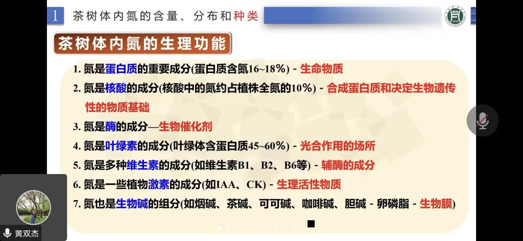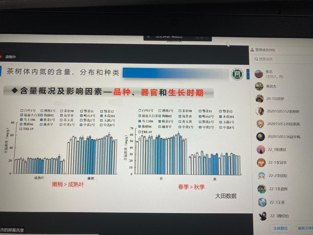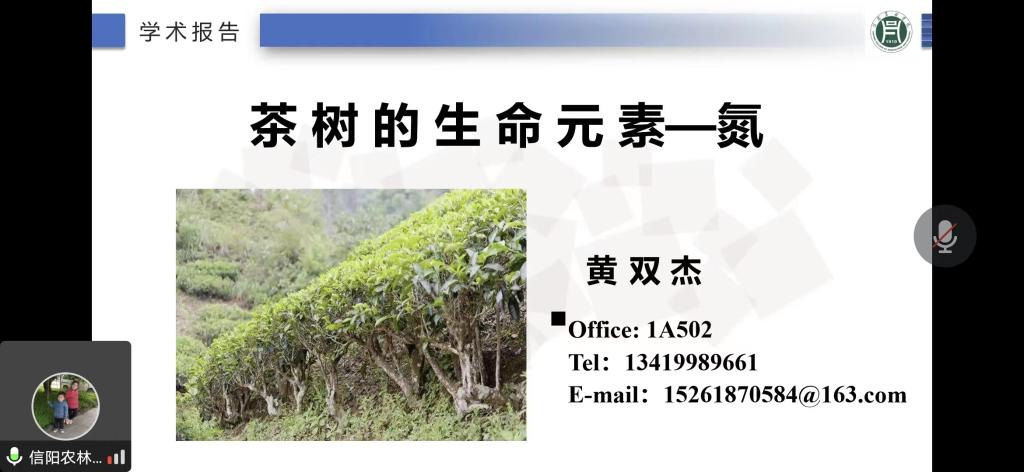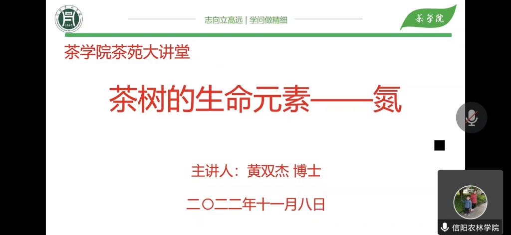 2022年11月8日下午,茶学院黄双杰博士为师生作了题为“茶树的生命元素—氮”的学术报告。报告会通过线上渠道开展,茶学院院长郭桂义教授、副院长陈义及专业教师和学生共120人参加了报告会,会议由茶学院副院长陈义主持。