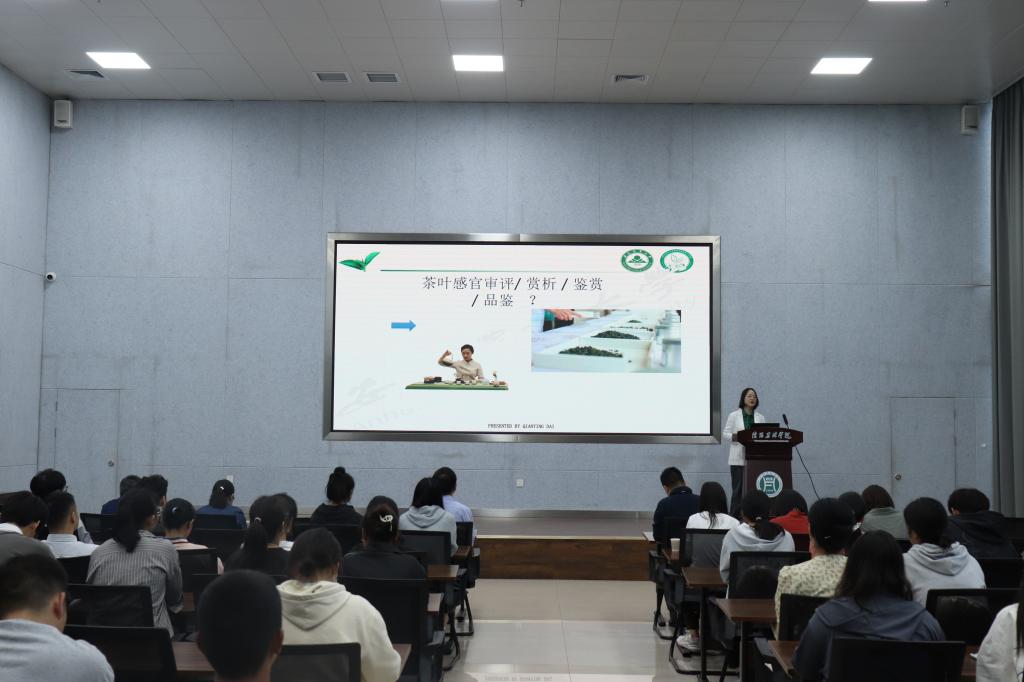 报告会上,陈院长首先介绍了戴前颖教授的研究方向和研究成果。随后,戴前颖教授围绕茶叶感官审评及量化表征技术的主题,结合自身研究成果,从色泽的表征及应用、香气的评价、滋味的量化及应用、感官评价方法在皖西黄茶实物标准样研制上的应用等四个方面展开了具体论述。戴教授的报告深入浅出,拓宽了师生的视野,增加了师生对茶叶感官审评及量化表征技术研究的了解。