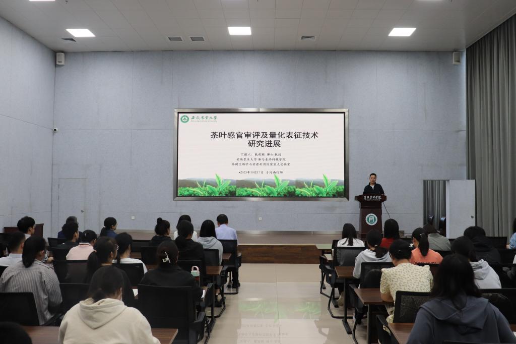 10月17日下午,安徽农业大学戴前颖教授在双创中心多媒体报告厅为茶学院师生作了题为“茶叶感官审评及量化表征技术研究进展”的学术报告。茶学院院长、党总支书记郭桂义教授、实验设备管理处处长王广铭、茶学院副院长陈义教授及部分专业教师和在校学生、茶叶行业从业者二百余人通过线上线下结合的方式参加了报告会,报告会由茶学院副院长陈义教授主持。