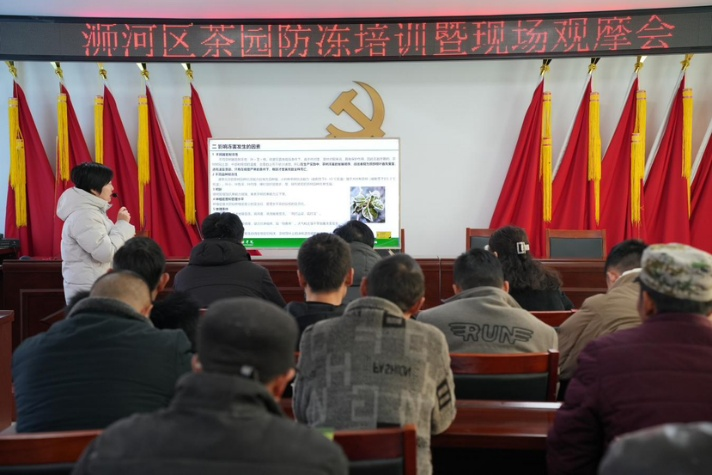 以河南省博士服务团为契机,为加强校地合作,2025年1月17日,受信阳市浉河区茶产业发展中心黄辉主任和我院博士服务团成员、茶产业发展中心副主任黄双杰的邀请,河南省“科技副总”、beat365在线平台官网茶学院罗金蕾博士、赵琛杰老师以及农学院植保教研室博士潘鹏亮教授一行到董家河镇黄龙寺村和浉河港镇黑龙潭村,开展茶园防冻技术培训和现场观摩会,有90余名来自不同领域的茶企、茶农代表参加。