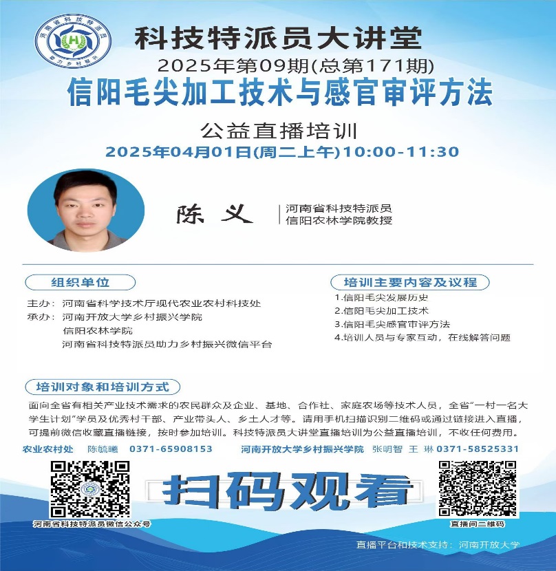为助力茶产业提质增效,指导2025年信阳毛尖春茶生产,以科技赋能助力乡村振兴。4月1日上午,我院河南省科技特派员陈义教授受河南省科技厅现代农业农村科技处的邀请,赴郑州做河南省科技特派员大讲堂公益培训。培训采用线上直播形式进行,陈义教授的培训题目为“信阳毛尖加工技术与审评方法”,在培训中,他从信阳毛尖生产历史与荣誉、标准化发展历程、信阳毛尖加工工艺相关术语及注意事项、信阳毛尖加工工艺演变历史、信阳毛尖加工工艺流程、信阳毛尖感官审评方法等方面进行了详细讲解,并分享了不同做形对信阳毛尖耐泡性影响、不同嫩度信阳毛尖品质特点、不同鲜叶部位鲜叶生化成分特点等近年相关研究结果。陈义教授在培训前对课件和讲稿进行了精心准备,培训过程中他细致讲解,条理清晰,深入浅出,培训结束后对培训人员提出的问题进行了详细解答。本次培训在线人数高达3400余人,取得了较好成效,得到了广泛的关注 。(撰稿:罗金蕾 摄影:河南开放大学张明智)