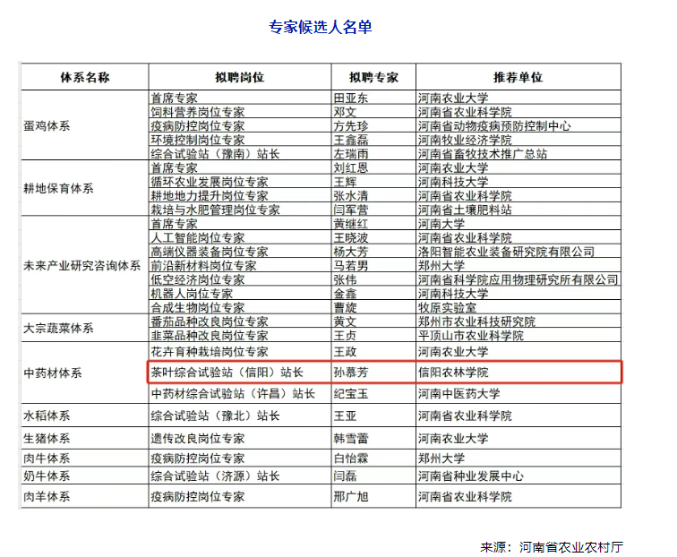 近日,河南省农业农村厅公示了河南省现代农业产业技术体系专家候选人名单。茶学院院长孙慕芳教授被聘为河南省现代农业产业技术体系专家,担任中药材体系—茶叶综合试验站(信阳)站长一职。