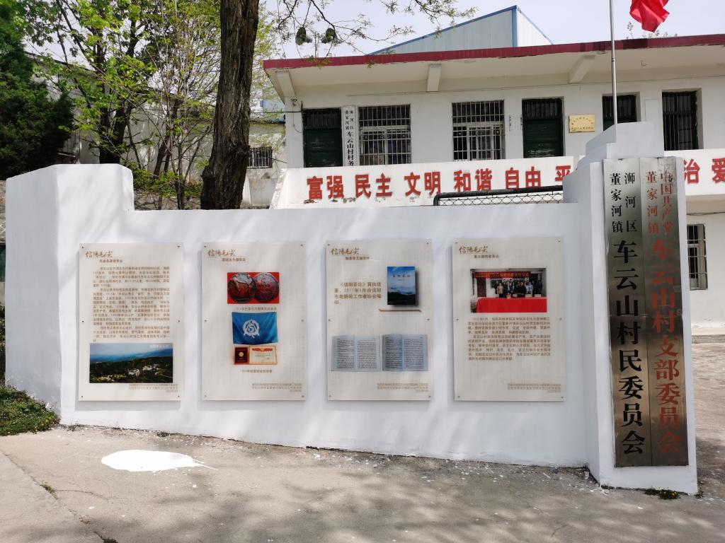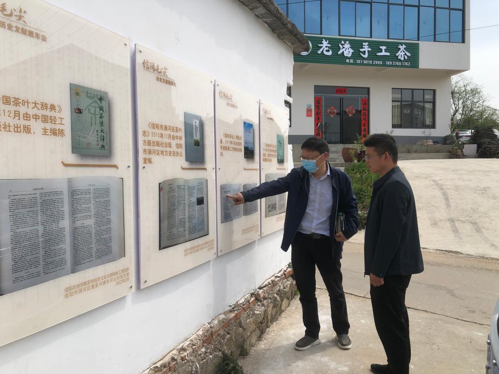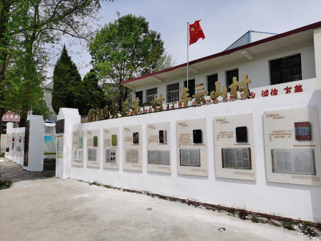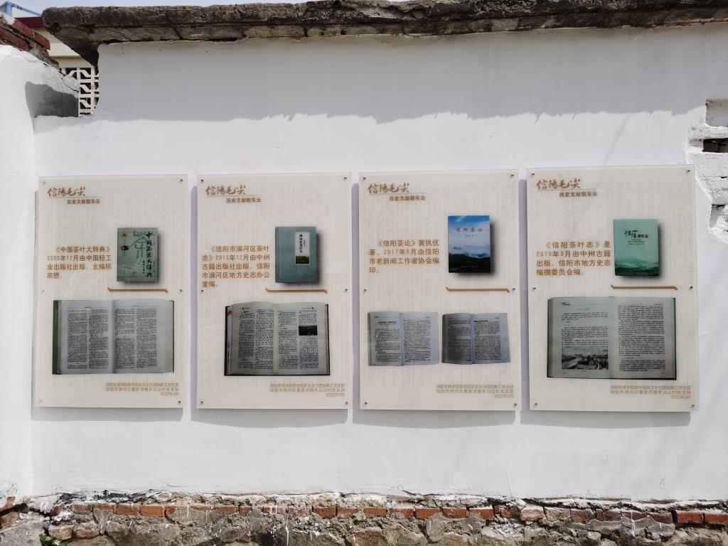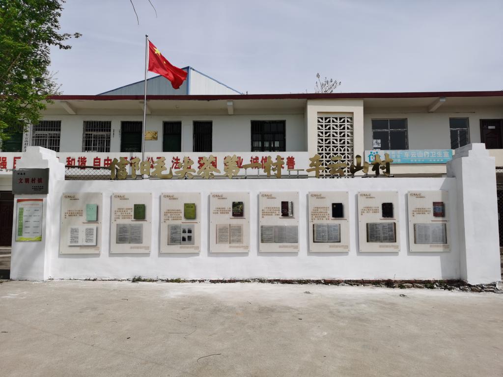 “信阳毛尖茶第一村----车云山村”茶文化墙由16块展板组成,包括“历史名茶话车云、历史文献载车云、荣冠古今源车云、制茶技艺始车云、星火相传在车云”等5个部分。“历史名茶话车云”简要介绍了车云山村的基本情况和茶产业茶文化发展历史与现状;“制茶技艺始车云”介绍了信阳毛尖制作技艺的演变及在车云山的最后形成;“星火相传在车云”介绍了茶学院茶文化与营销教工党支部与信阳市浉河区董家河镇车云山村党支部开展结对共建活动。“历史文献载车云”部分12块展板,收集展示了从1966年到2019年12本茶叶著作对信阳毛尖的介绍评价,1966年5月我国著名茶学专家庄晚芳、张堂恒编著科学普及出版社出版的《茶叶》:“信阳毛尖产于河南信阳,以车云山的品质最好。外形细圆光直,汤色翠绿,清香持久,滋味醇厚,叶底鲜嫩。”,1979年8月湖南农学院主编、农业出版社出版的全国高等农业院校试用教材《茶叶审评与检验》:“信阳毛尖产于河南信阳地区,以车云山的品质最好。”,1979年11月著名茶学专家安徽农学院陈椽教授主编、农业出版社出版的全国高等农业院校试用教材《制茶学》:“信阳毛尖,以车云山毛尖品质最优、香高耐泡。”,1982年2月俞寿康编著、农业出版社出版的《中国名茶志》:“信阳毛尖……,车云山,在信阳西面,茶树多种在云雾弥漫的高山地区,产茶品质最优。”,1985年由茶学家陈椽主编,安徽省科学技术委员会、安徽农学院出版《中国名茶研究选集》:“信阳毛尖的产地为信阳县和罗山县及信阳相邻地区的一小部分山区。信阳县优质毛尖产地主要分布在车云山、集云山、天云山,云雾山、震雷山、黑龙潭和白龙潭等群山峰顶上,而品质最优是车云山之天雾塔峰,有人称浉河中心水,车云顶上茶。”,1988年12月,由王泽农、王镇恒、刘家坤、阮宇成、张堂恒等我国第一代、第二代著名茶学专家编写、农业出版社出版的《中国农业百科全书(茶业卷)》:“信阳毛尖,主产于河南信阳地区。主产地为信阳县车云山、集云山、天云山,云雾山、震雷山、黑龙潭和白龙潭等地。以车云山所产之品质最优”;1992年陈宗懋主编《中国茶经》,2000年王镇恒主编《中国名茶志》,2000年陈宗懋主编《中国茶叶大辞典》,2017年我省著名茶叶专家黄执优《信阳茶论》,以及2015年《信阳市浉河区茶叶志》、2019年《信阳茶叶志》均记载,车云山是信阳毛尖茶著名产地。