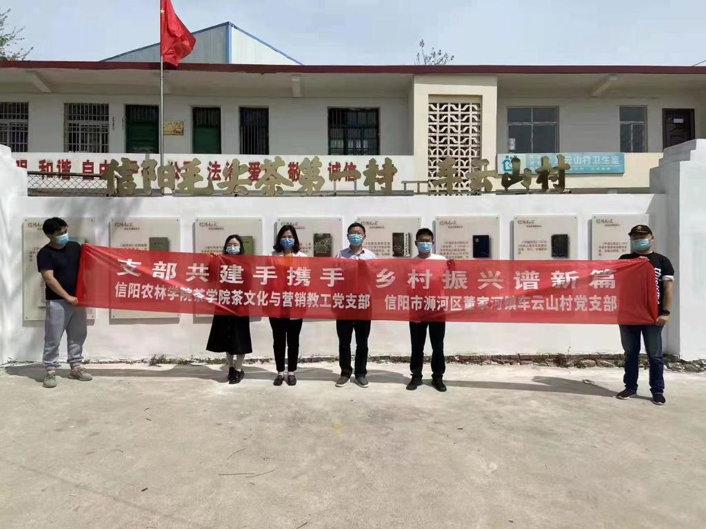 茶学院茶文化与营销教工党支部与信阳市浉河区董家河镇车云山村党支部开展结对共建活动,4月8日,信阳毛尖茶春茶上市之际,茶学院茶文化与营销教工党支部为车云山村党支部建设的“信阳毛尖茶第一村----车云山村”茶文化墙正式建成。茶文化墙包括两部分:“习近平的‘茶之道’”与“信阳毛尖茶第一村----车云山村”茶文化墙。茶文化墙包括“历史名茶话车云、历史文献载车云、荣冠古今源车云、制茶技艺始车云、星火相传在车云”等5个部分。