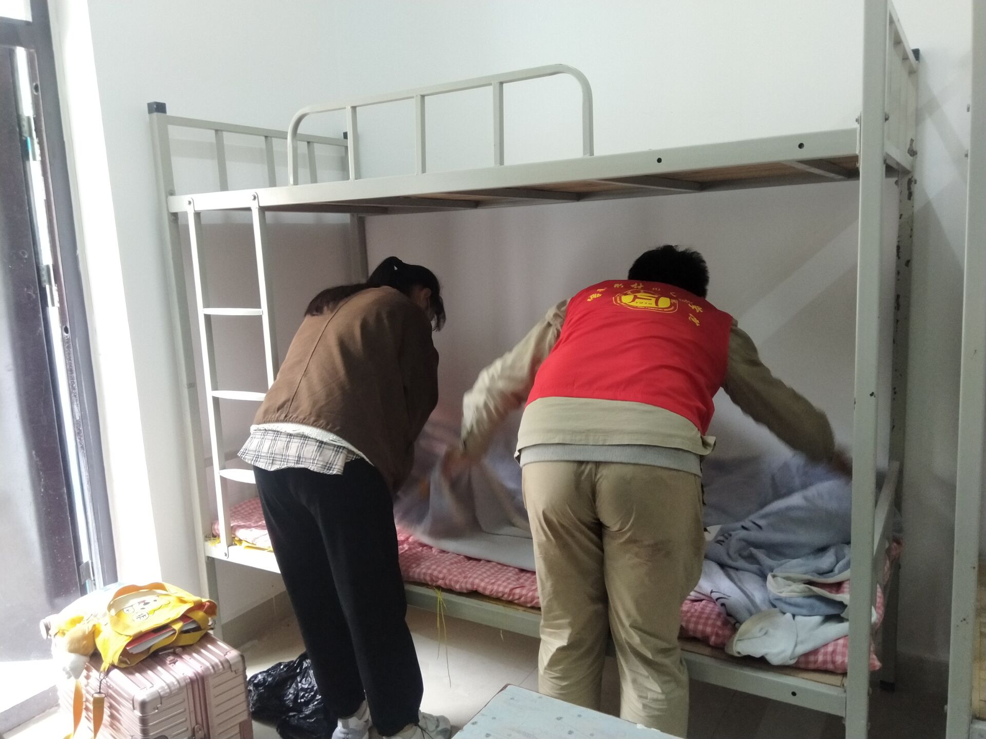 党员同志们不仅在迎新现场一对一服务新生,还主动帮助志愿者协调工作,带领新生进宿舍,帮忙拎行李和生活用品,为他们整理床铺,细致、周到,温暖备至。