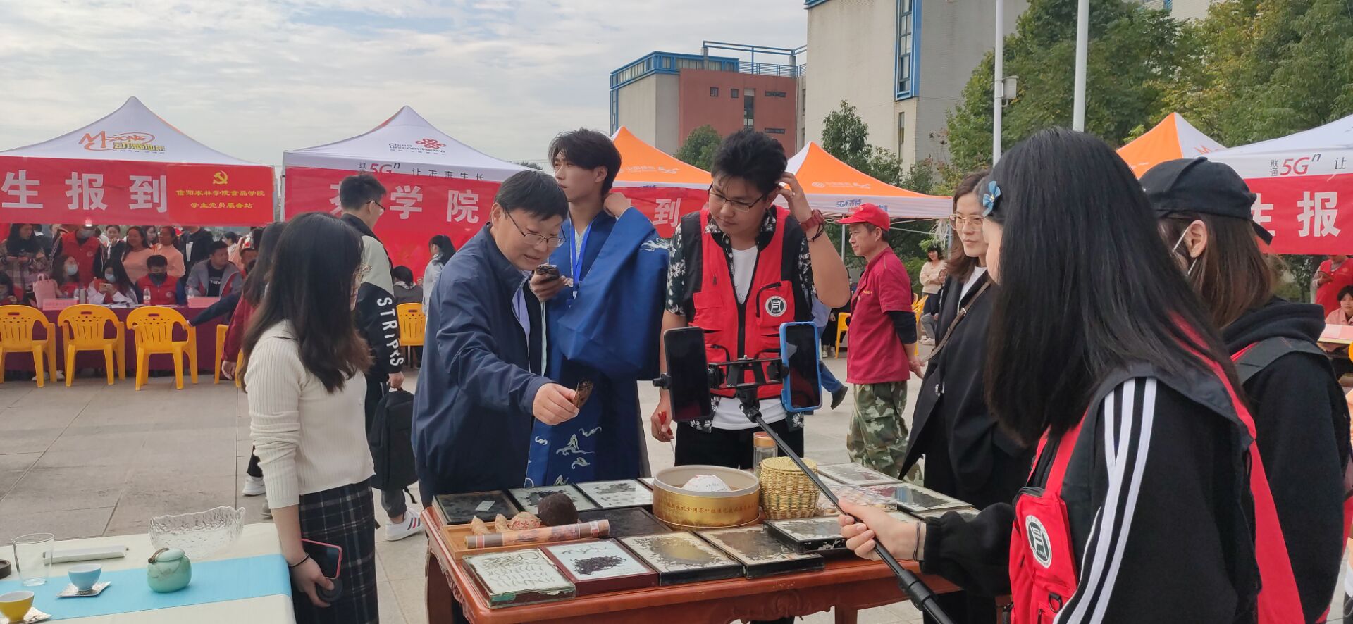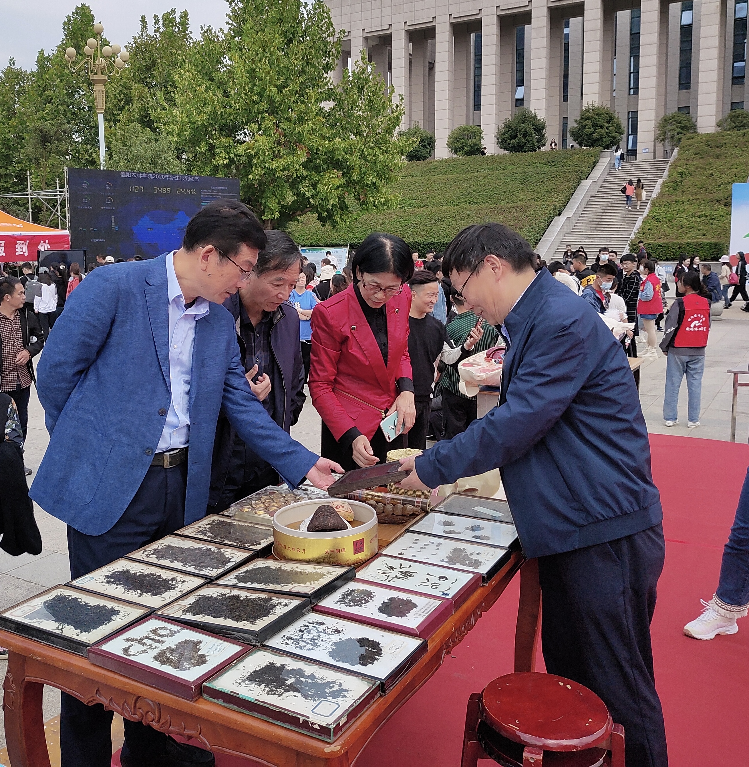 今年茶学院在迎新现场特别设计了茶叶标本展台,展示了茶学院茶叶标本室收集的上世纪80年代中期的茶叶标本和各种紧压茶标本,还有茶席设计展台。院长郭桂义亲自为校领导和感兴趣的同学们讲解茶叶样品的种类和保存时间等。