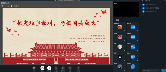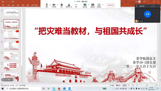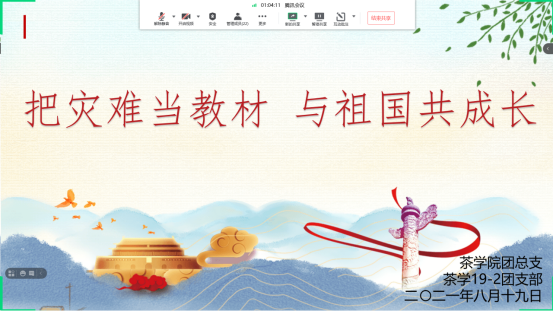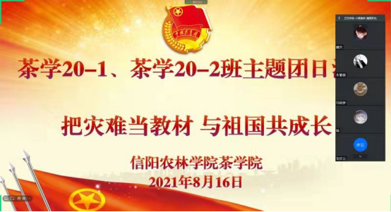 根据中共河南省委高校工委,中共河南省教育厅党组发布的《关于在防汛救灾中深化“把灾难当教材 与祖国共成长”主题教育的通知》,团省委《关于统筹助力疫情防控和防汛救灾工作的倡议书》等通知文件要求,同时,为引导我院广大团员青年把灾难当教材,与祖国共成长,团结一致、迎难而上,坚决打赢疫情防控阻击战和灾后救援重建攻坚战贡献青春力量,在校团委示范性线上团日活动的指导下,8月15-22日,茶学院各团支部开展“把灾难当教材,与祖国共成长”主题团日活动。