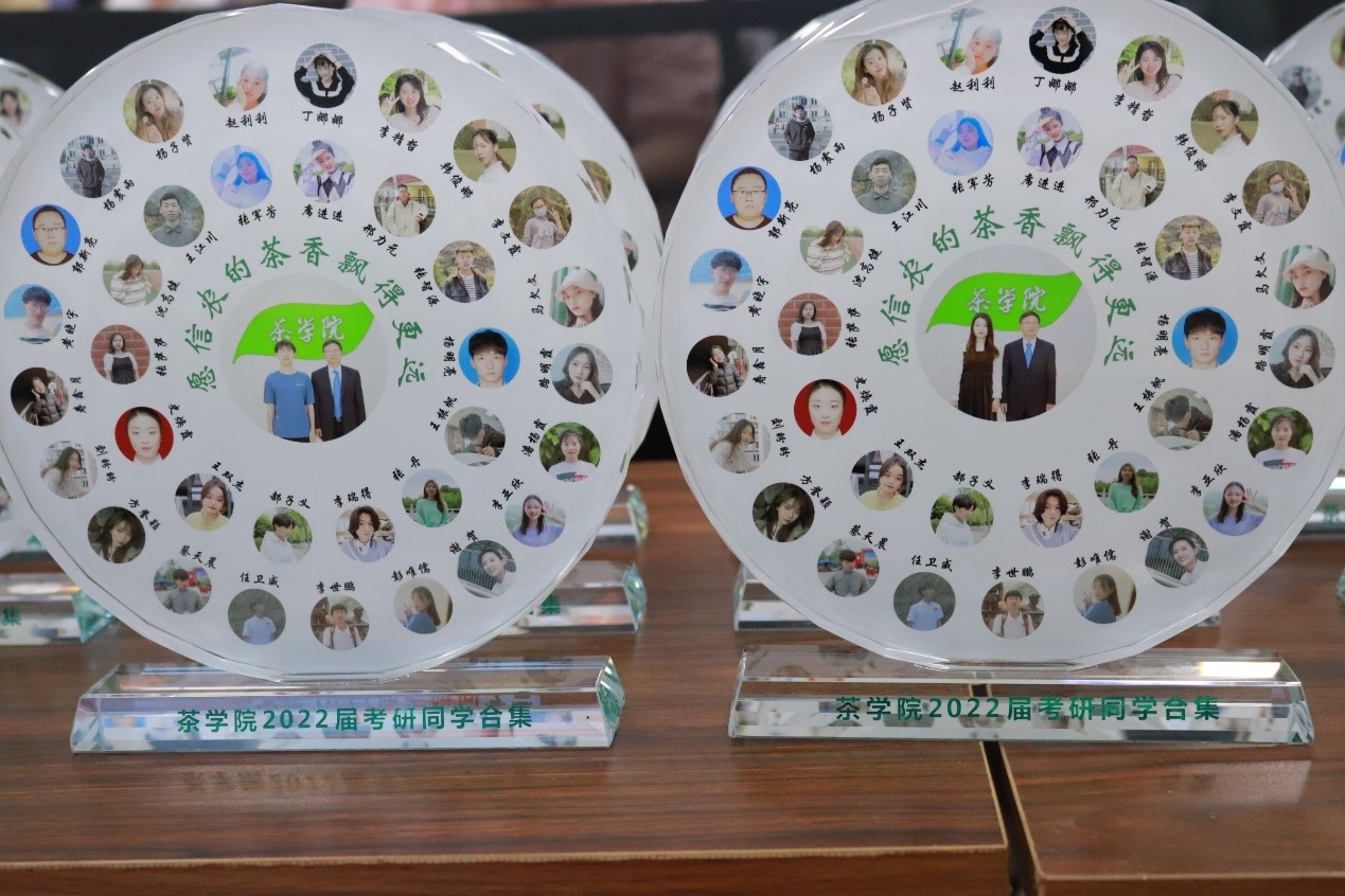 大会首先对考上硕士研究生的35位毕业生进行了表彰,颁发纪念奖杯。奖杯由35位同学头像组成的两个同心圆构成,圆心为该同学与茶学院党总支书记、院长郭桂义教授的合影。成绩属于过去,成绩也代表未来,希望受到表彰的同学在今后的求学和人生道路上,越走越顺,越走越宽!