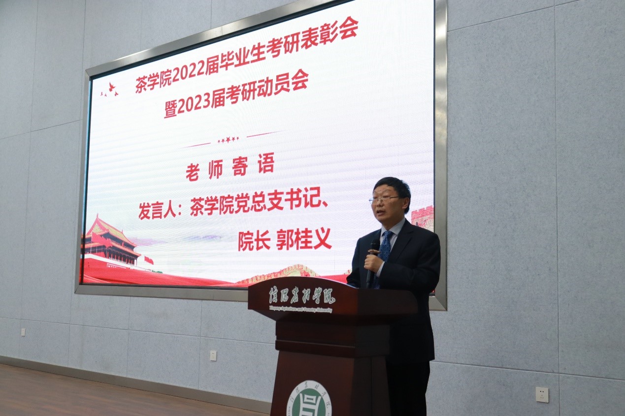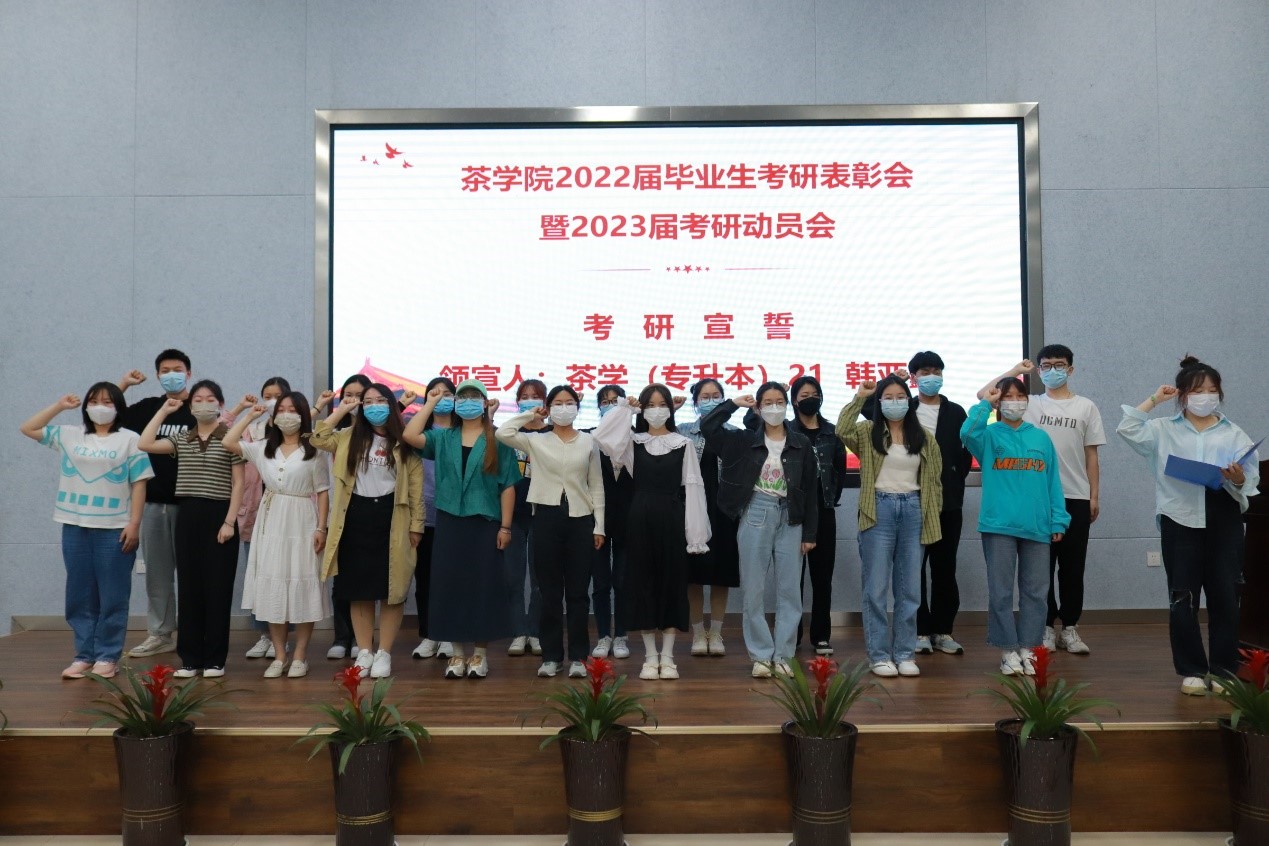 行而不辍,未来可期 —茶学院于2022520日下午在学术交流中心多功能报告厅举行2022届毕业生考研表彰暨2023届考研动员会。茶学院党总支书记、院长郭桂义、党总支副书记朱建梅、副院长陈义、团总支书记王子浩、茶学实验中心主任尹鹏、茶文化与营销教研室副主任王杉、茶学(专升本)20班辅导员杜之正及受表彰的2022届考研学生和2023届拟考研学生代表参加了大会。会议由副院长孙慕芳主持,分毕业生考研表彰、拟考研学生代表发言、考研宣誓、老师寄语四个阶段。