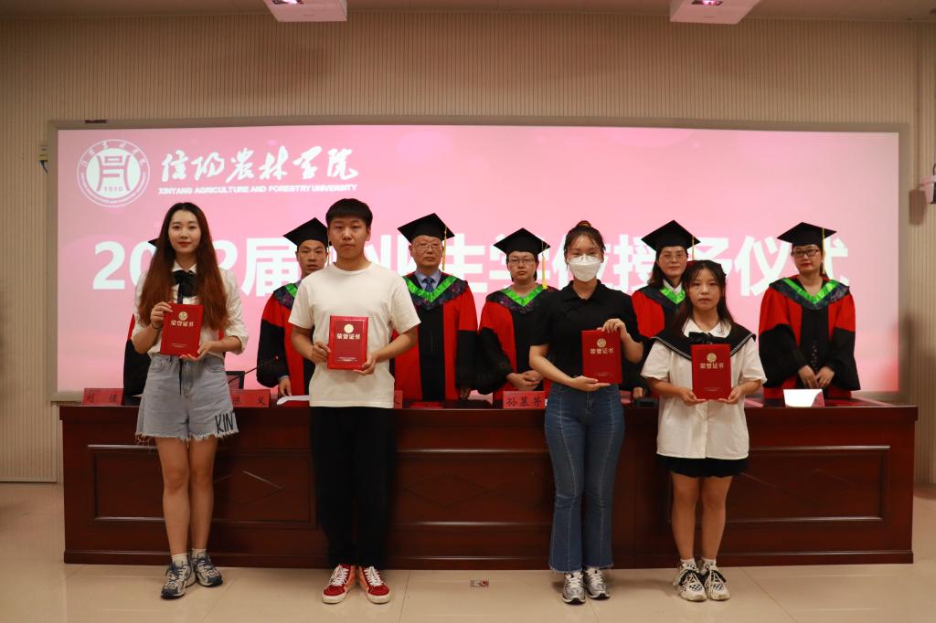 陈义宣读了茶学院2022届省级和校级优秀应届毕业生名单,学院领导老师为2022届优秀应届毕业生颁发了荣誉证书。孙慕芳宣读了2022届本科毕业生学士学位授予决定,beat365在线平台官网学位评定委员会委员、茶学院学位评定分委员会主席、茶学院党总支书记、院长郭桂义教授为2022届茶学本科毕业生颁发学位证书并拨正流苏。