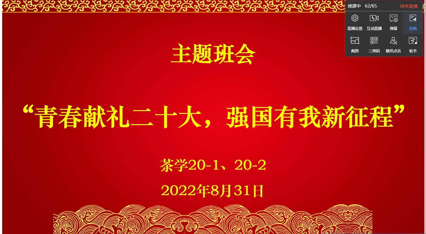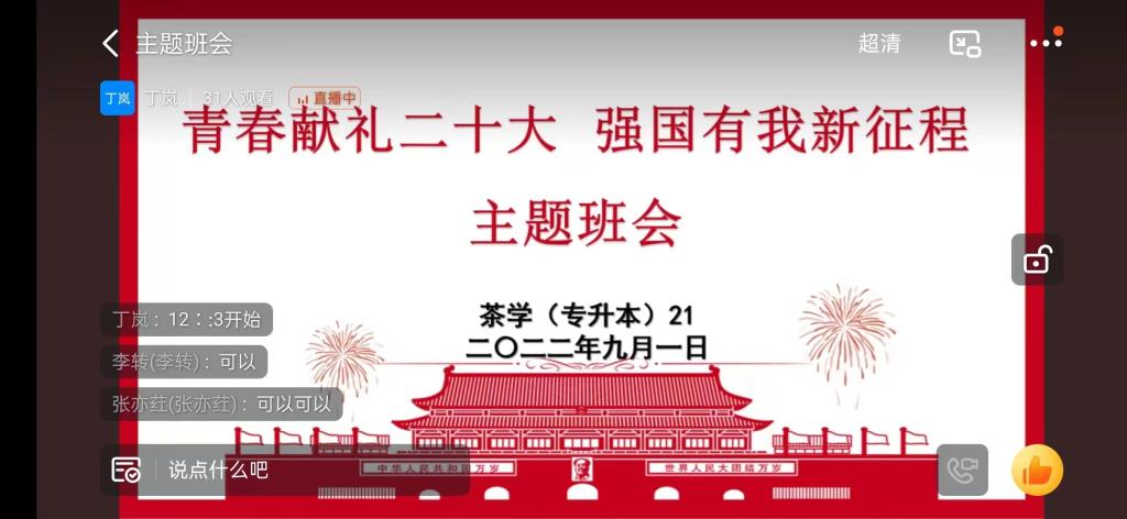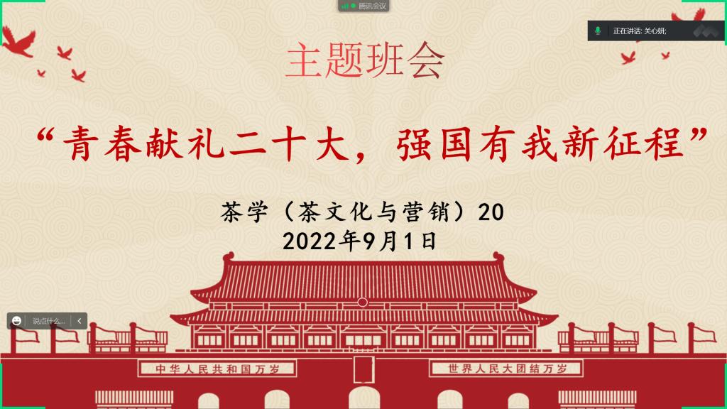 为进一步激发全院师生爱党、爱国、爱社会主义的热情,营造迎接、学习、宣传党的二十大的浓厚氛围,根据《beat365在线平台官网迎接学习宣传党的二十大主题宣传教育活动方案》和学校相关要求,近日,茶学院各班召开“青春献礼二十大,强国有我新征程”主题班会。