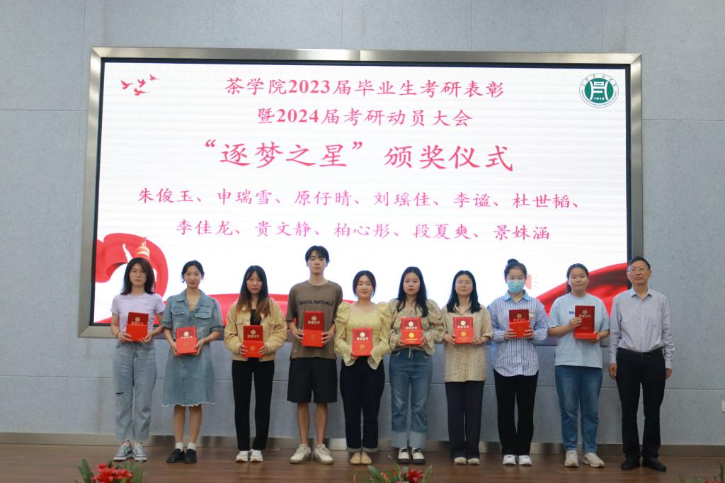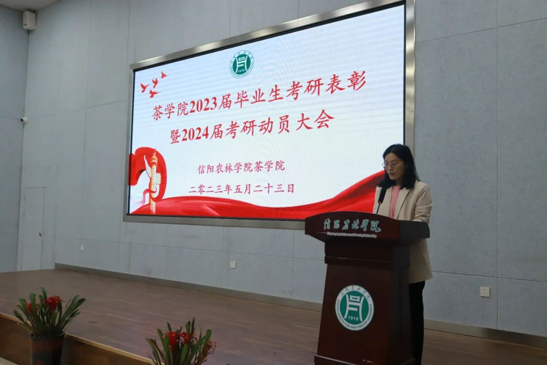 为表彰先进,树立典型,进一步培育良好学风,5月23日,茶学院在学术交流中心多功能报告厅召开了2023届考研表彰大会暨2024届考研动员大会。茶学院党总支书记、院长郭桂义教授、副院长陈义教授、党总支副书记朱建梅老师、团总支书记王子浩老师、组织员丁岚,2020级辅导员老师王杉、夏雨、朱尧和受表彰的2023届考研学生和2024届拟考研学生代表参加了大会。会议由党总支副书记朱建梅老师主持。