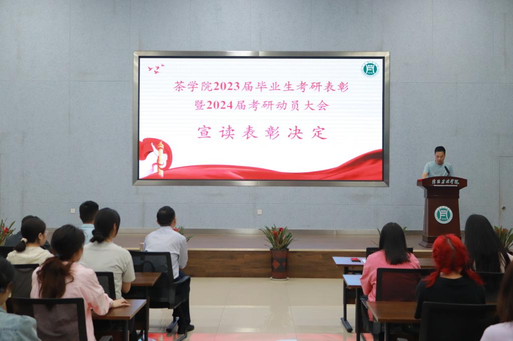 会议初,由茶学院副院长陈义教授宣读此次表彰的决定。今年,茶学院2023届毕业生凭借扎实的专业素养和过硬的综合素质,考研取得累累硕果,共有毕业生143人,成功考取研究生45人,录取率31.5%,他们分别被中国农业科学院茶叶研究所、南京农业大学、华中农业大学、西南大学、安徽农业大学、湖南农业大学、福建农林大学等院校录取。